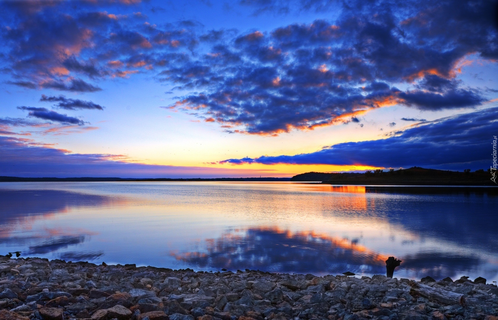 Edytor tapety: Jezioro, Kamienisty, Brzeg, Chmury, Zachód, Słońca