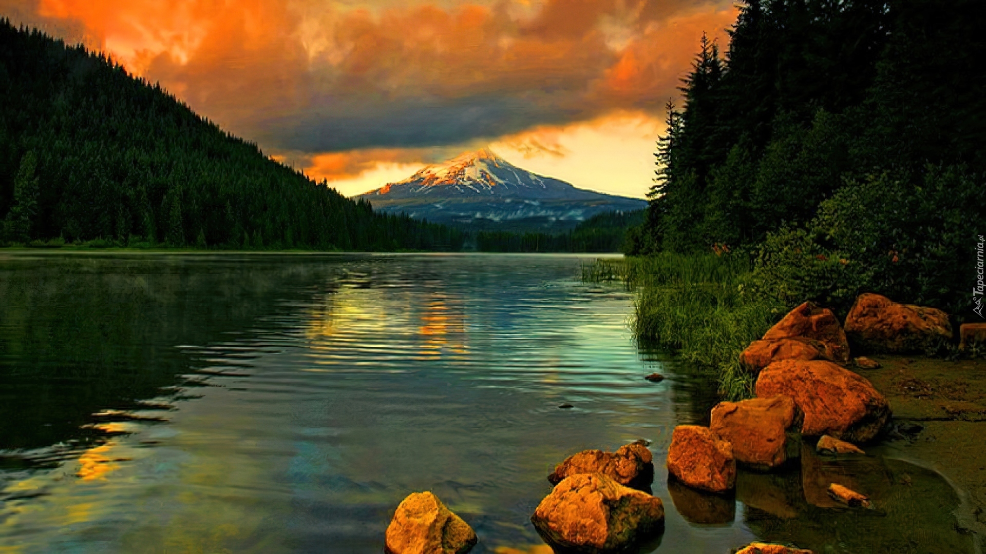 Edytor tapety: Jezioro, Kamienie, Niebo, Zachód Słońca