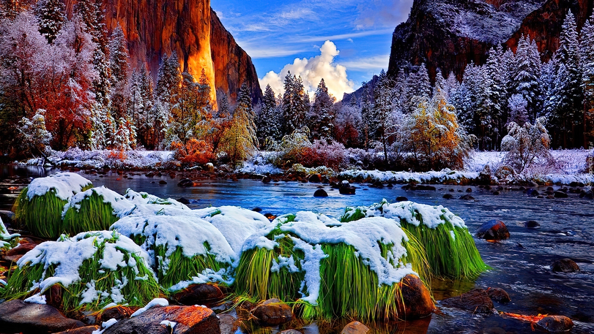 Edytor tapety: Jezioro, Skały, Trawy, Śnieg