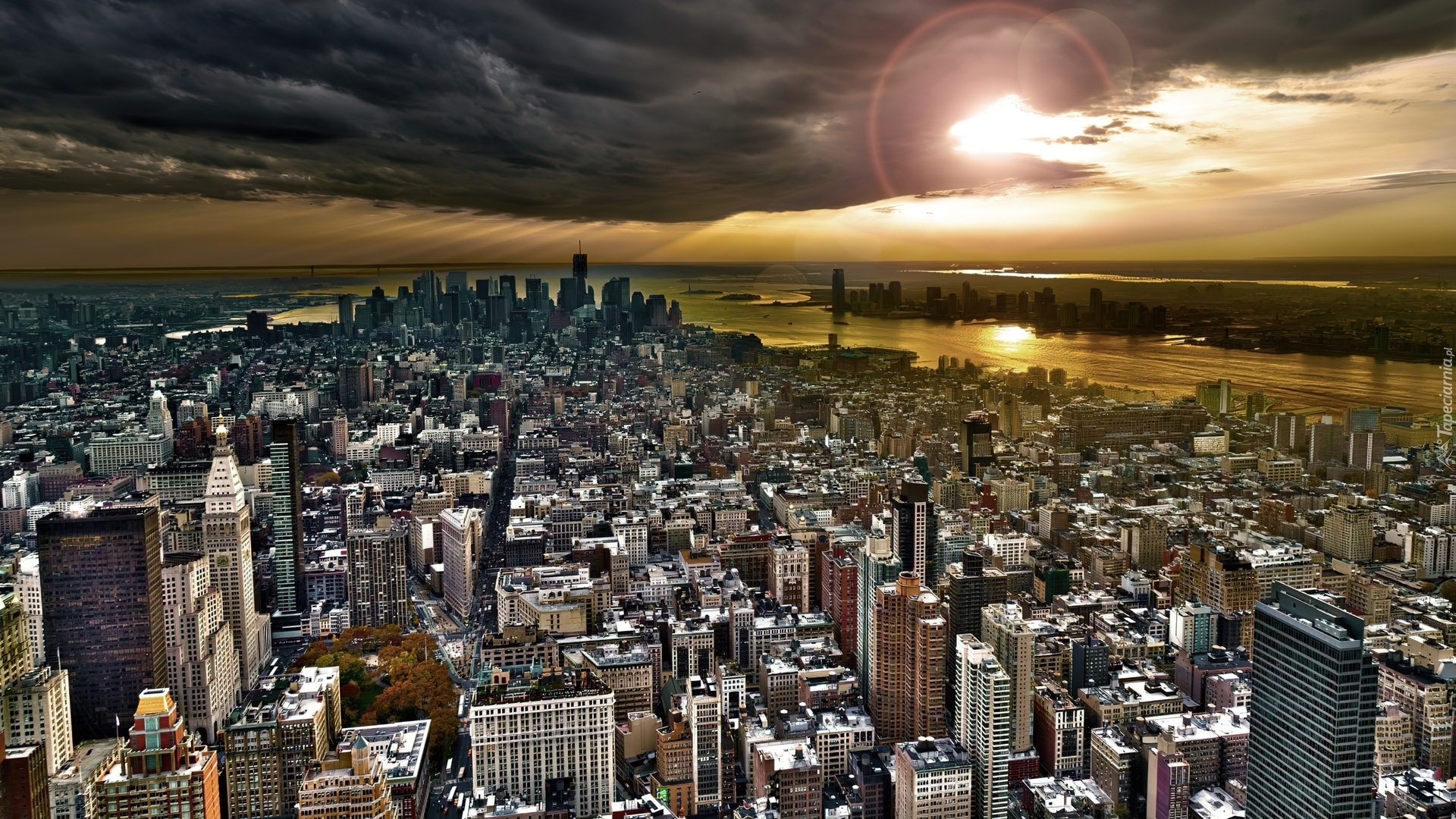 Edytor tapety: Miasto, Słońce, Przebujające, Przez, Chmury