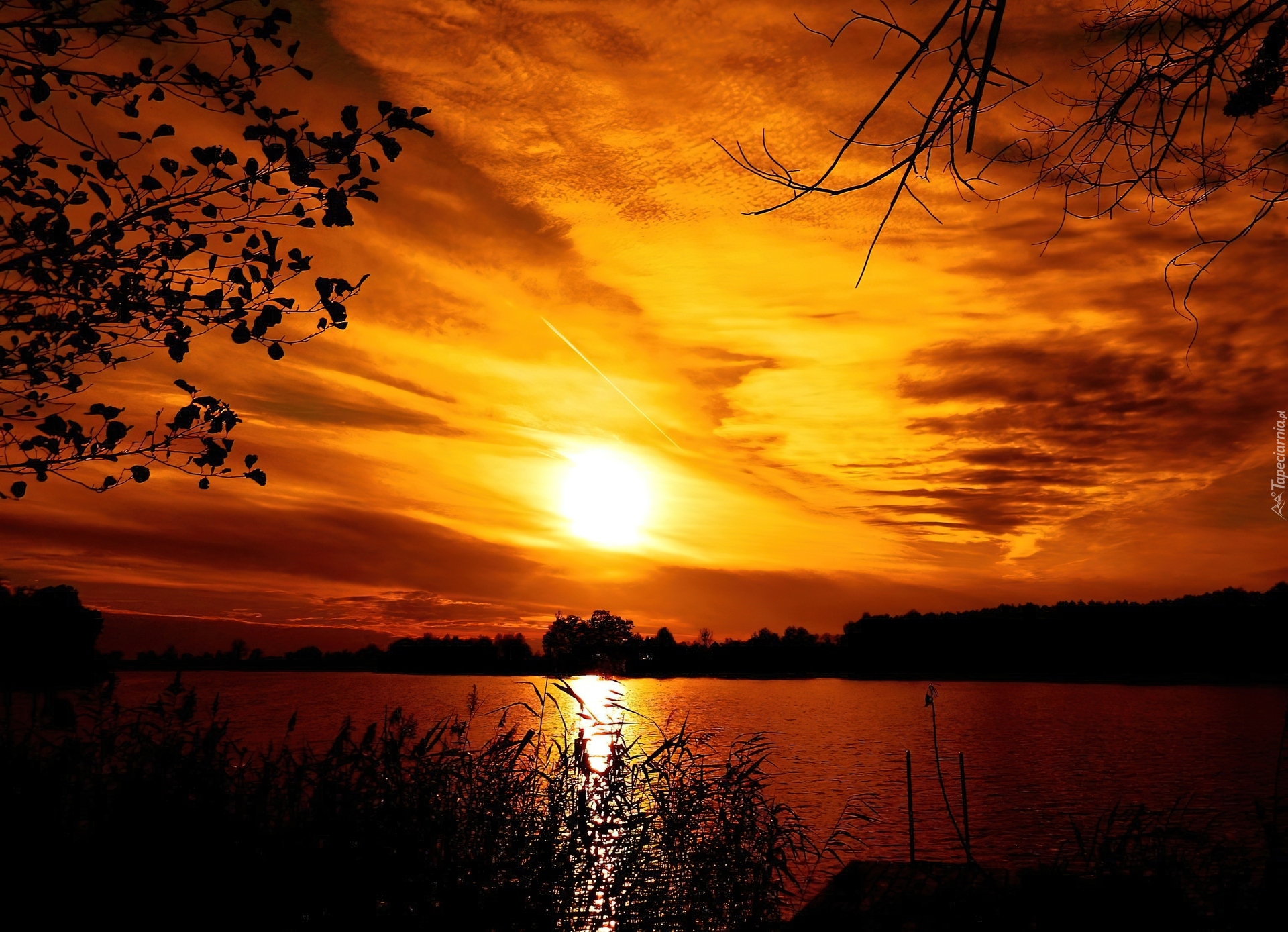 Edytor tapety: Zachód Słońca, Jezioro, Drzewa, Szuwary