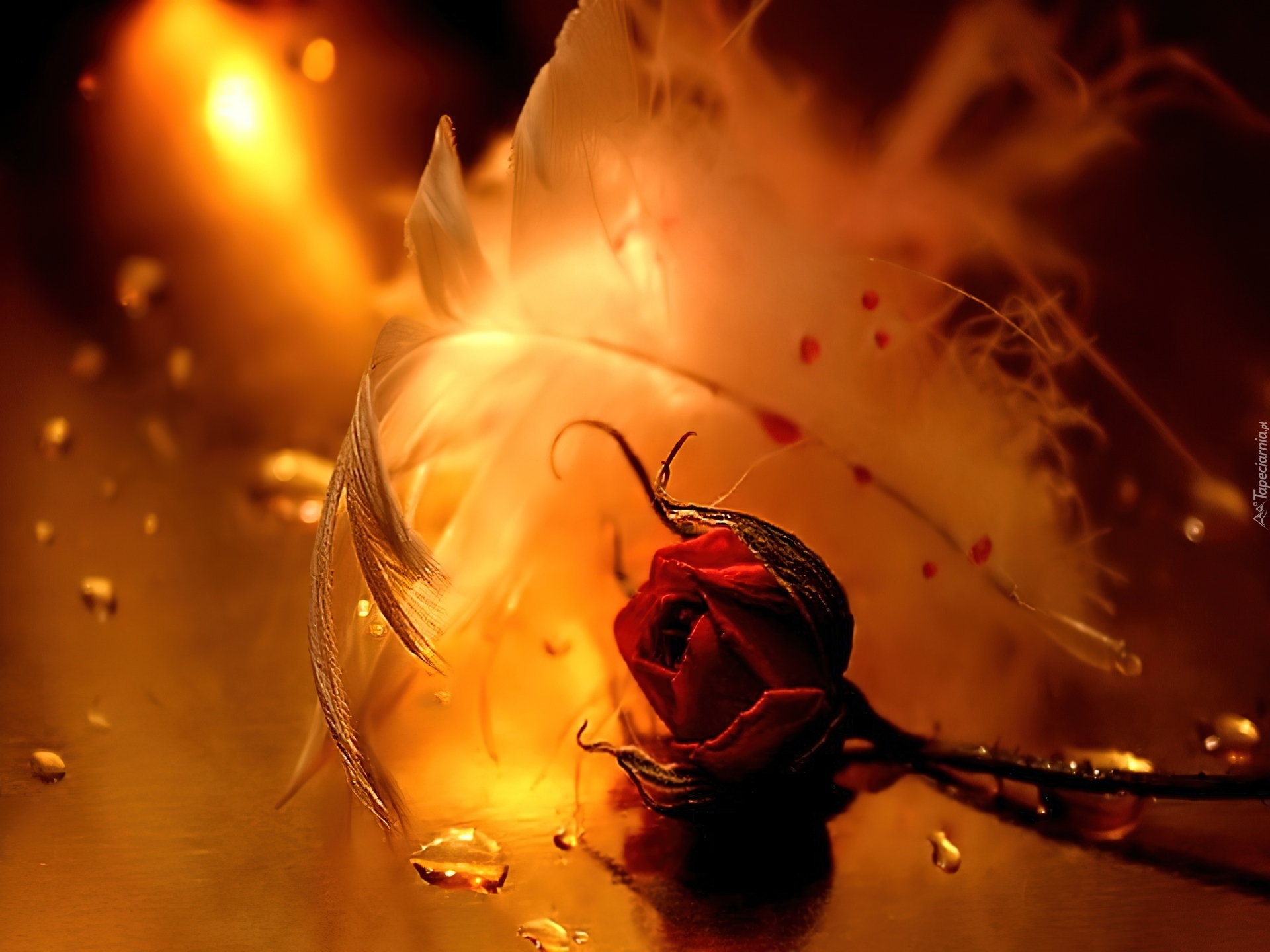 Edytor tapety: Czerwona, Róża, Krople, Wody, Piórko