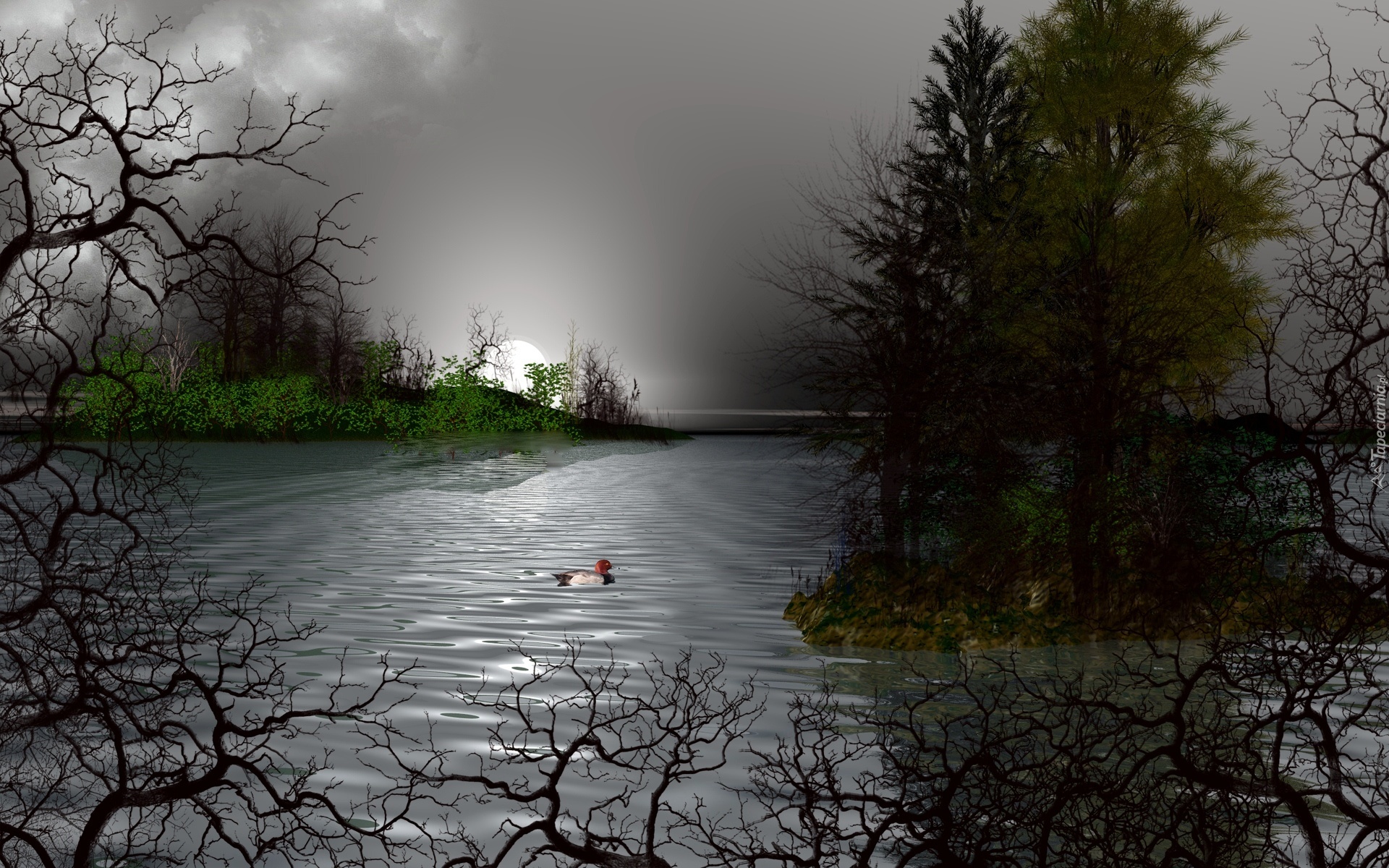 Edytor tapety: Jezioro, Noc, Drzewa, Kaczka