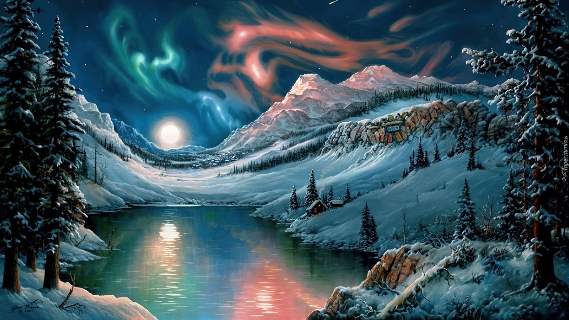 Edytor tapety: Góry, Jezioro, Zima, Zorza Polarna