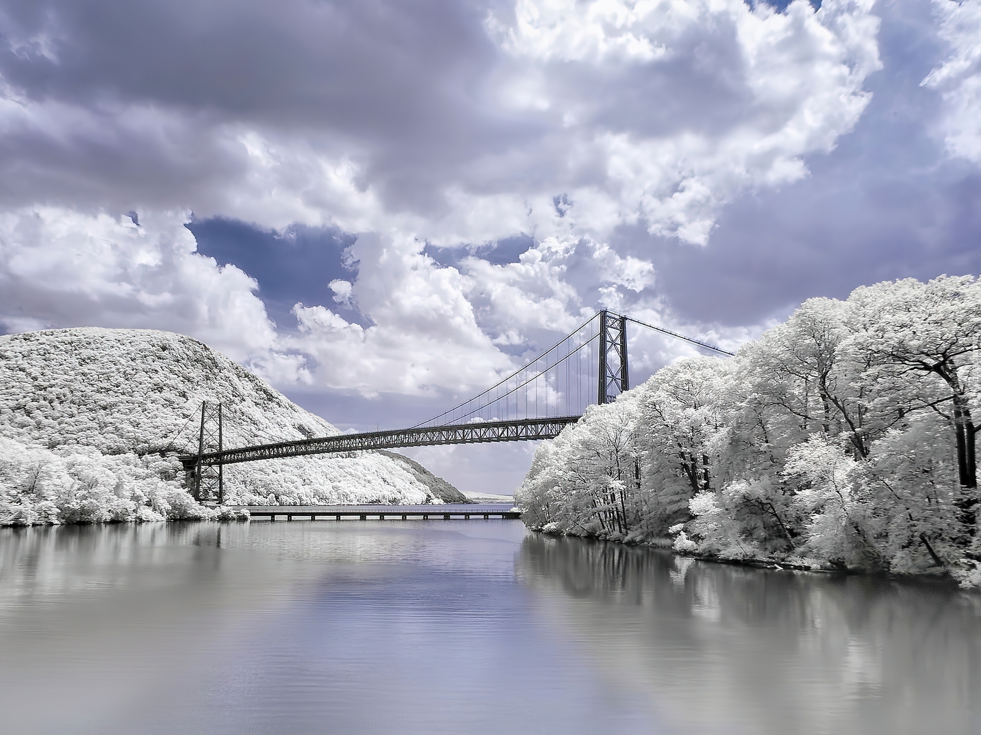 Edytor tapety: Rzeka, Drzewa, Most, Zima