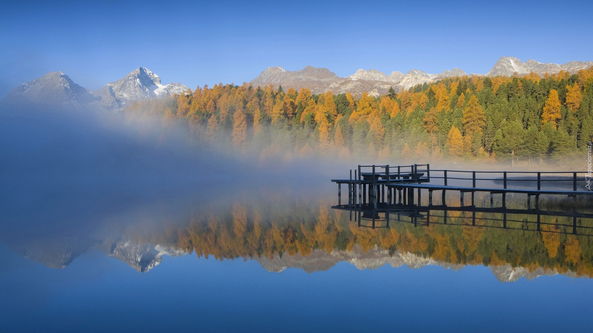 Edytor tapety: Jezioro, Molo, Lasy, Mgła