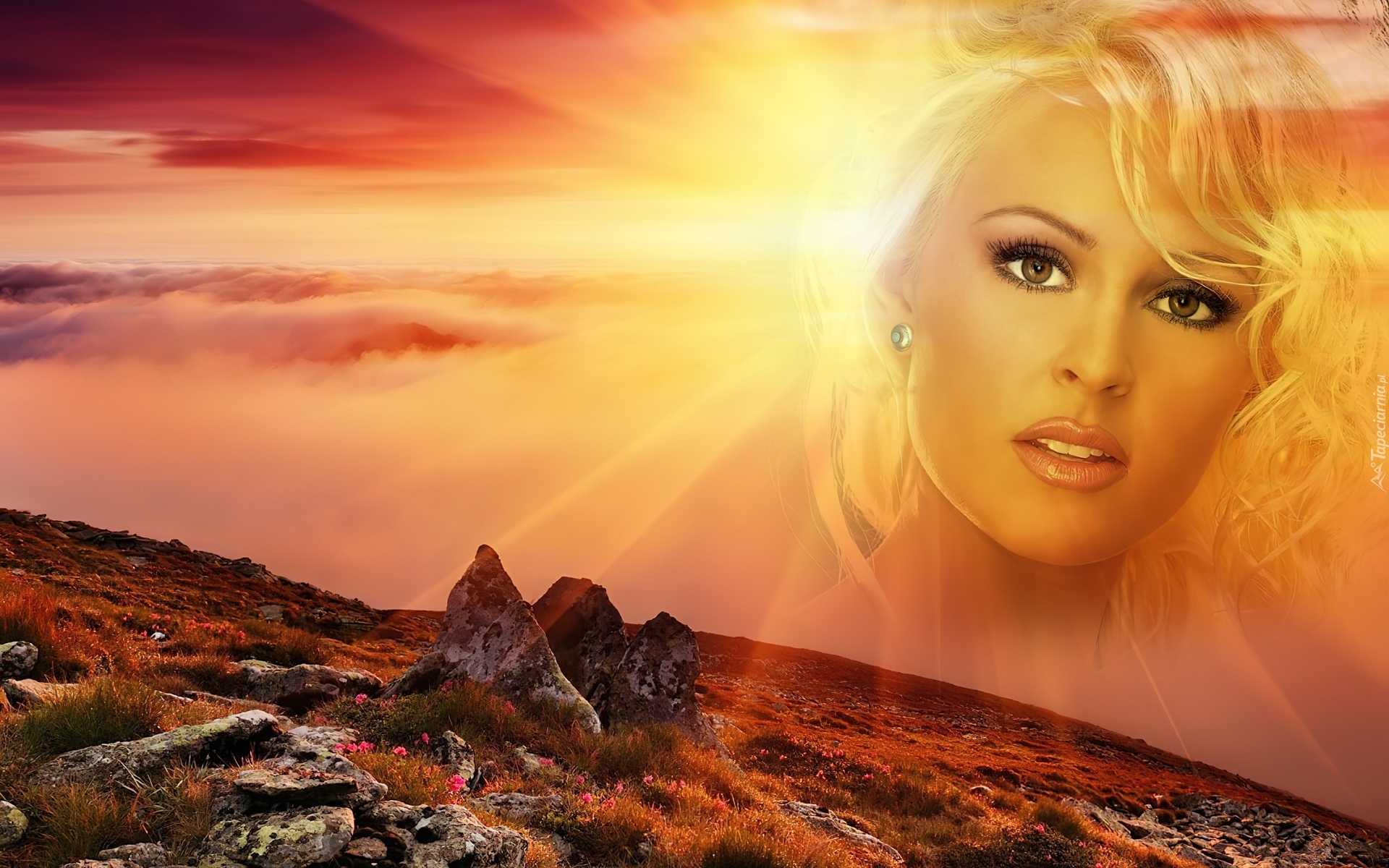 Edytor tapety: Promienie, Słońca, Skałki, Twarz, Kobiety