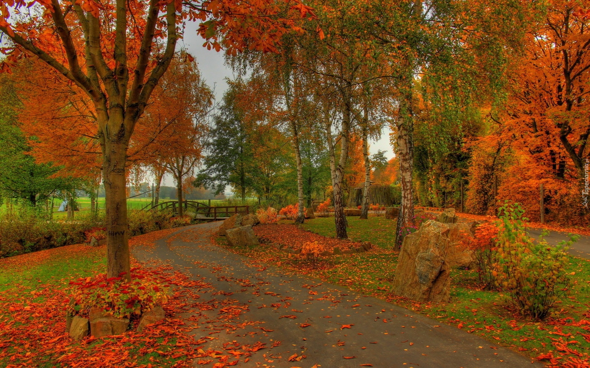 Edytor tapety: Park, Rzeka, Mostek, Aleja, Liście, Jesień