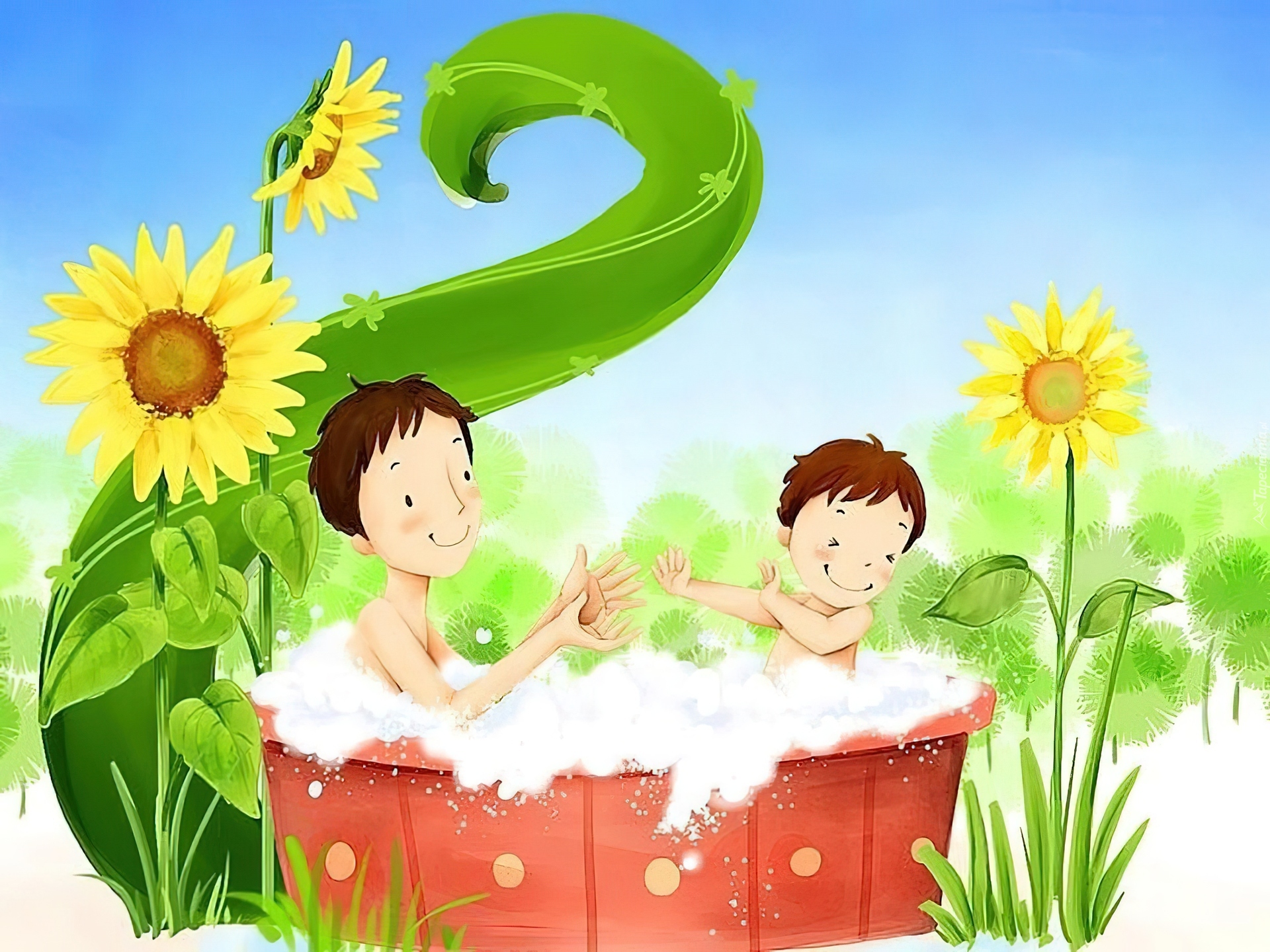 Edytor tapety: Chłopcy, Wanna, Kąpiel, Słoneczniki