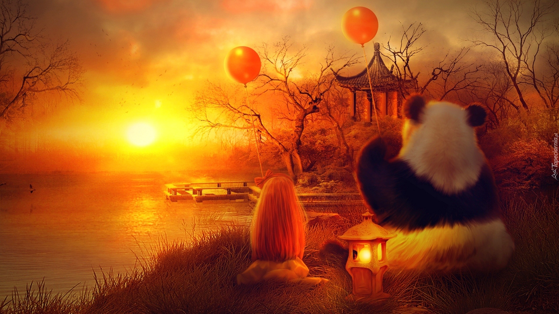 Edytor tapety: Mała, Dziewczynka, Miś, Panda, Zachód, Słońca