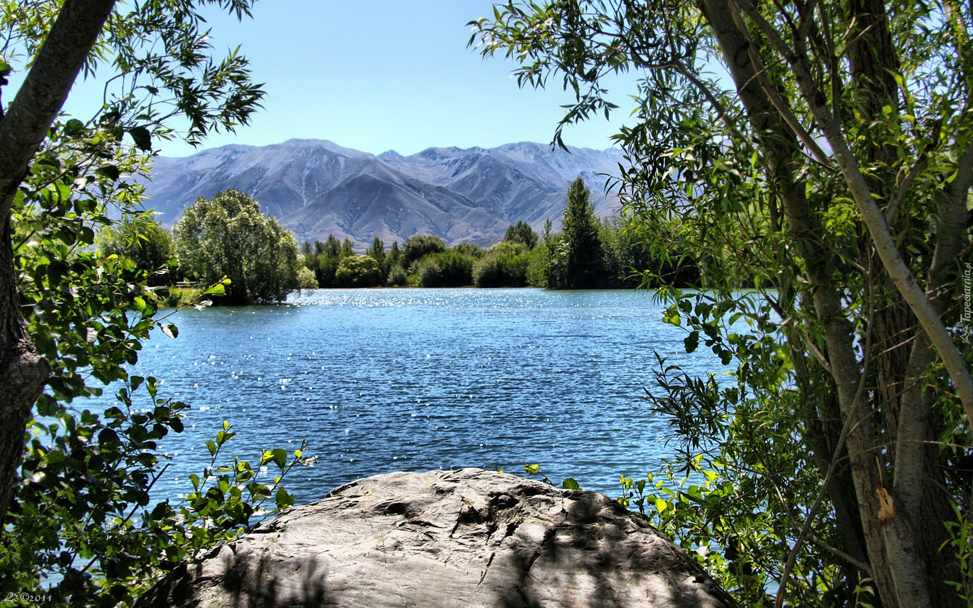 Edytor tapety: Góry, Jezioro, Drzewa, Głaz