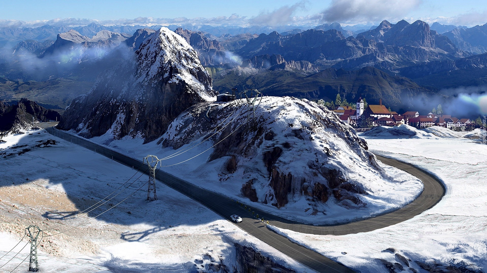 Edytor tapety: Góry, Droga, Chmury, Budynki, Zima