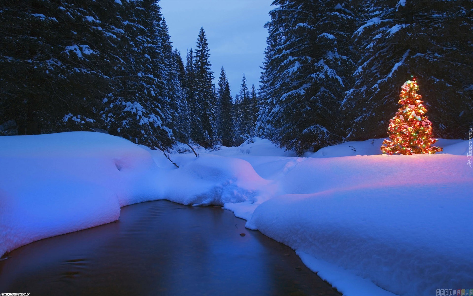 Edytor tapety: Las, Woda, Oświetlona, Choinka