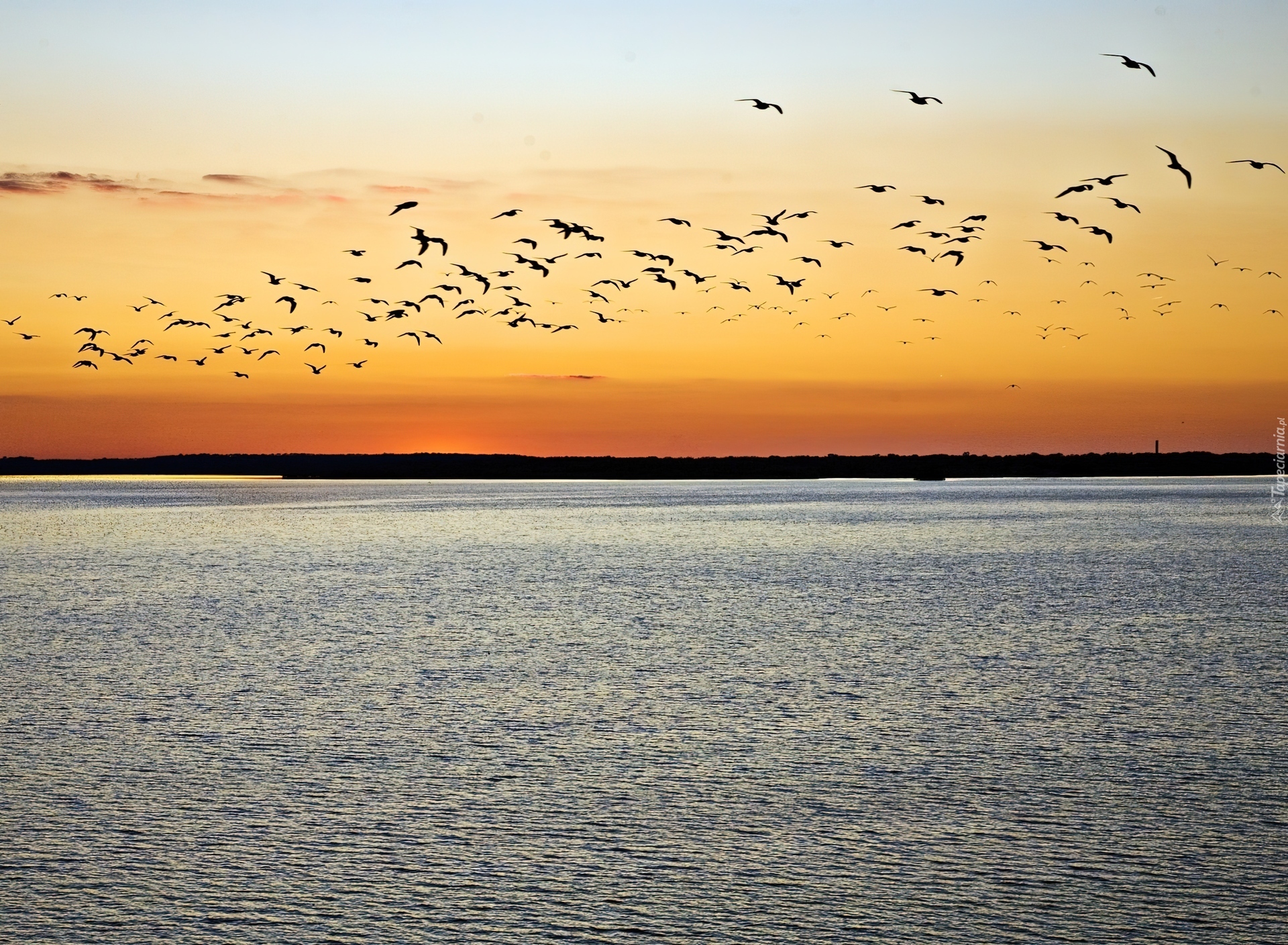 Edytor tapety: Jezioro, Ptaki, Zachód Słońca, Niebo