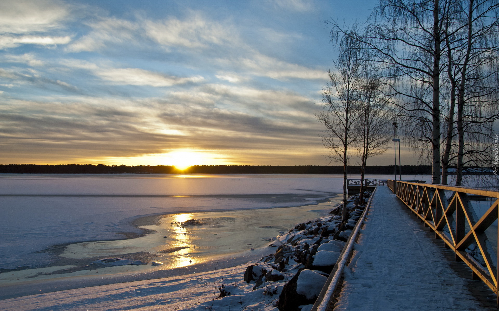 Edytor tapety: Zachód, Słońca, Zamarznięte, Jezioro, Pomost
