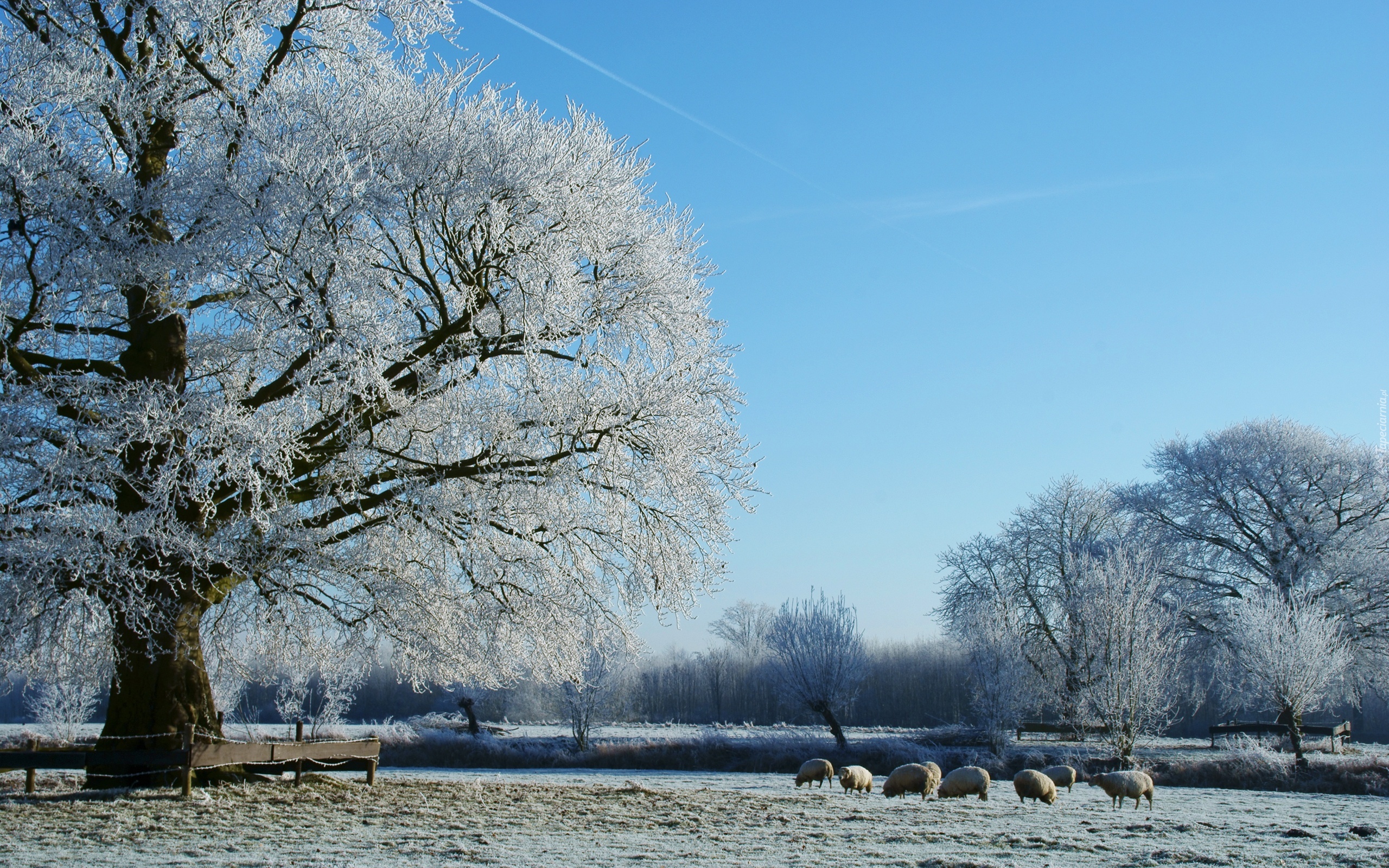 Edytor tapety: Rzeka, Drzewa, Owce, Zima