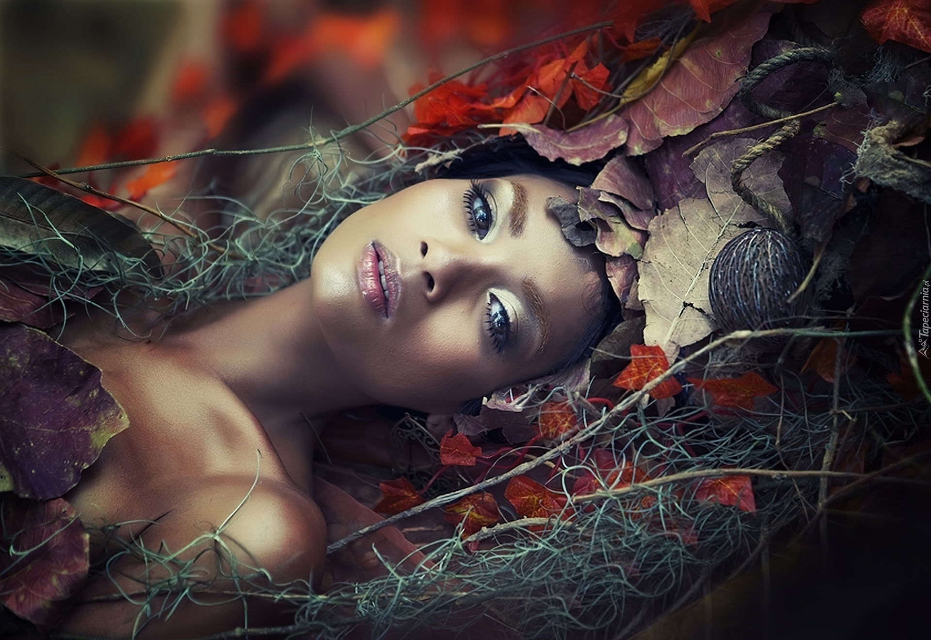 Edytor tapety: Kobieta, Czerwone, Liście, Suche, Gałęzie