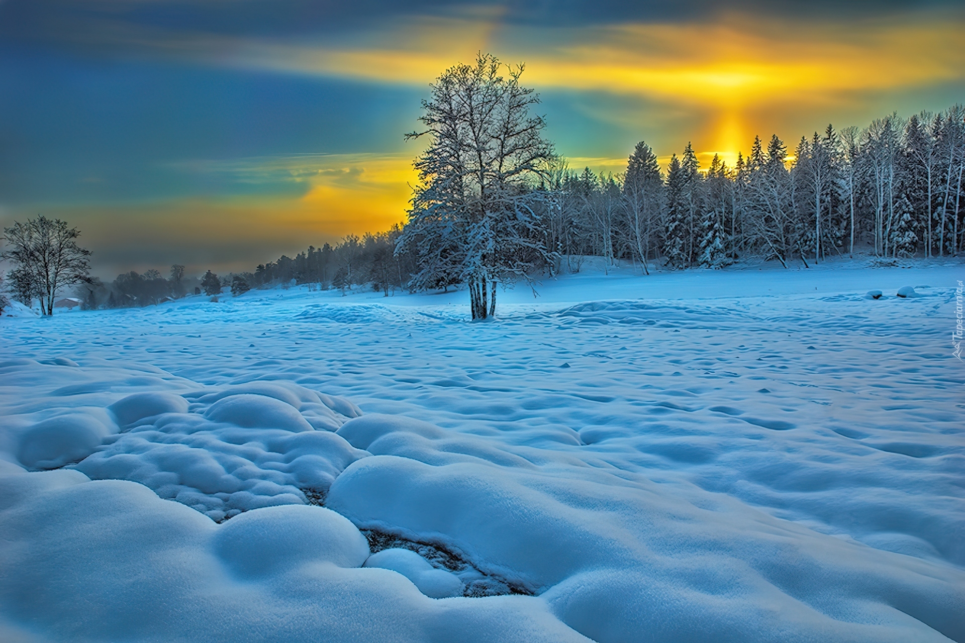 Edytor tapety: Zachód, Słońca, Las, Śnieg, Zima