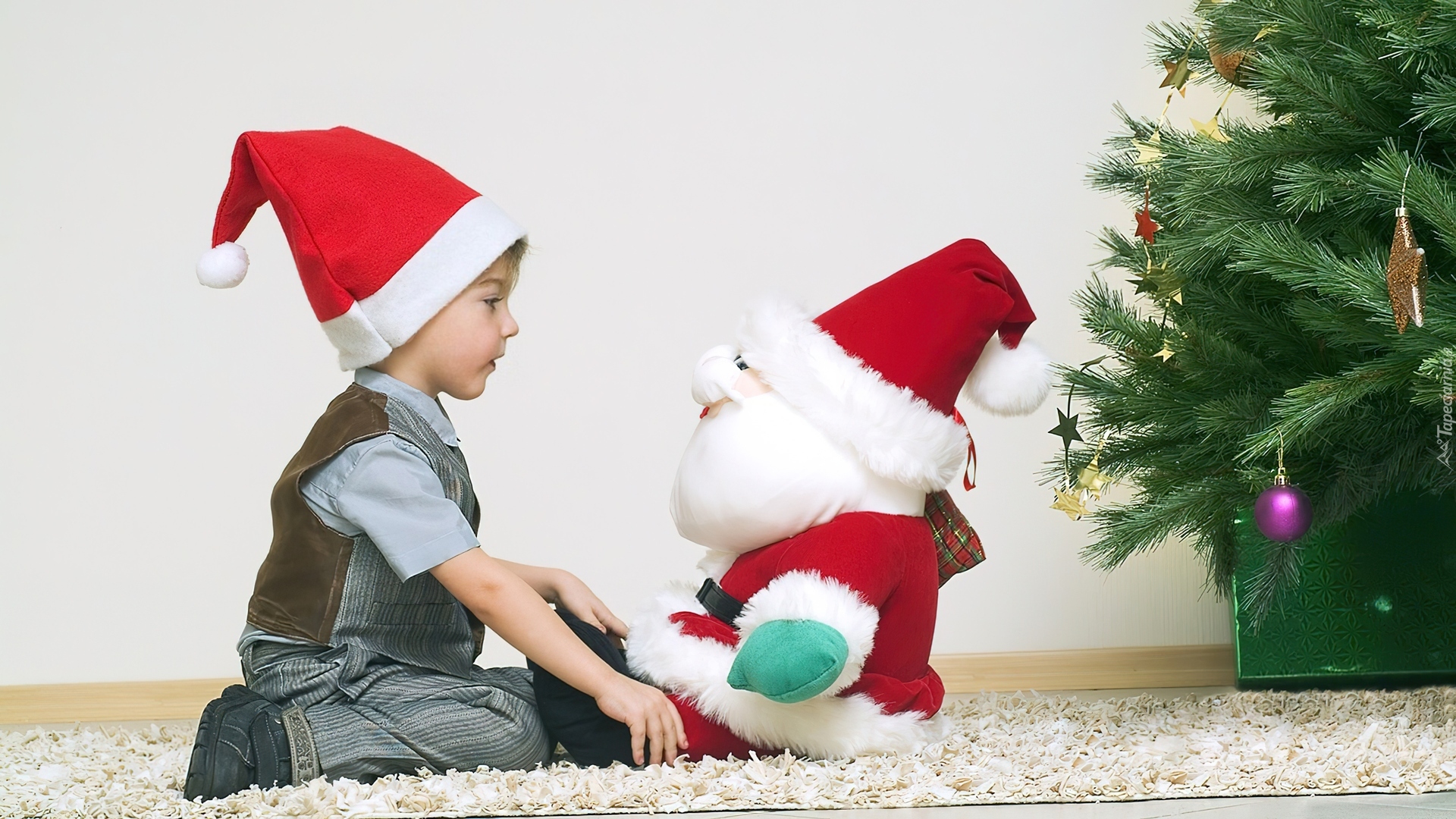 Edytor tapety: Chłopiec, Choinka, Mikołaj, Zabawka
