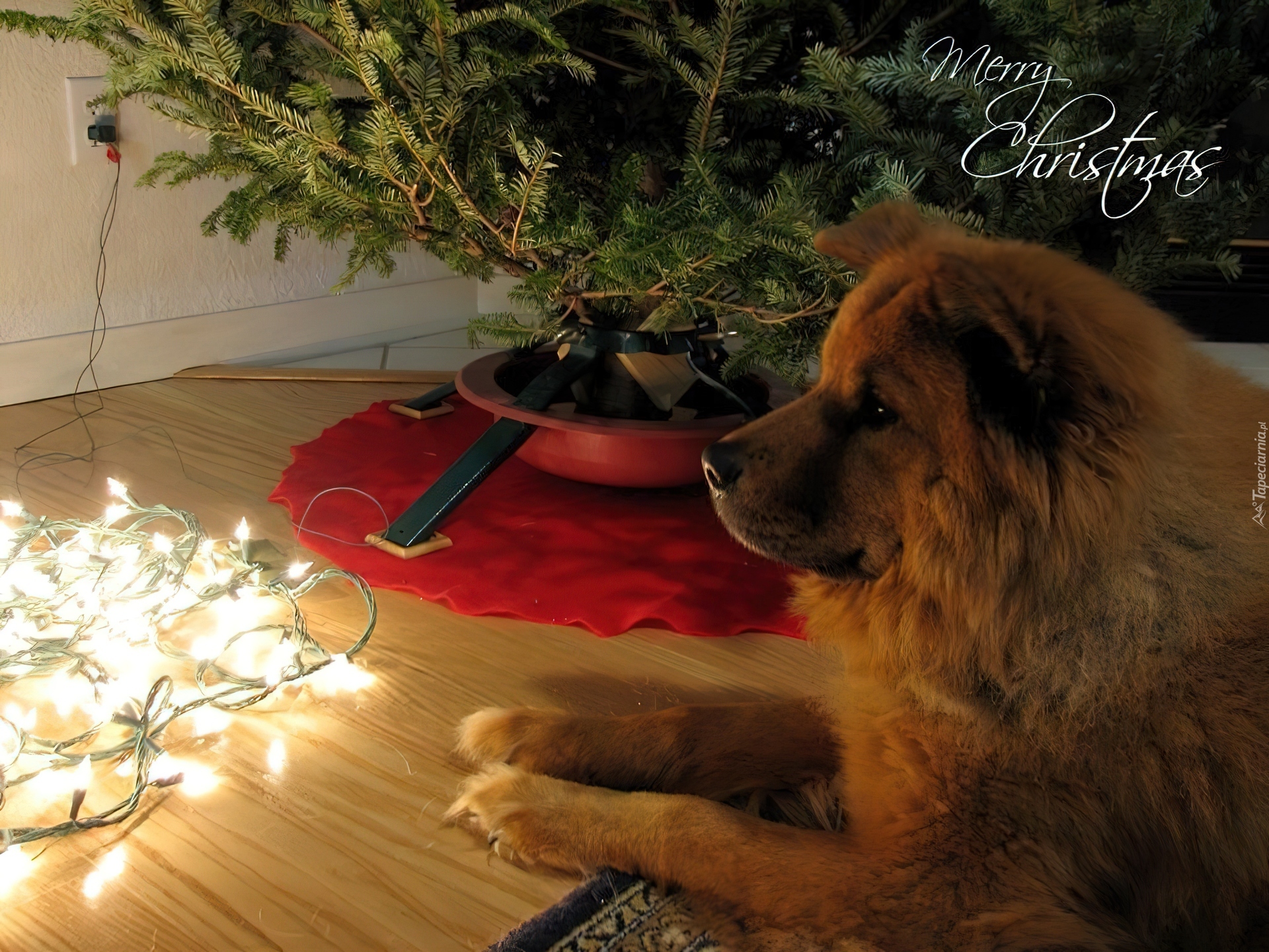 Edytor tapety: Pies, Lampki, Choinka, Wyczekiwanie