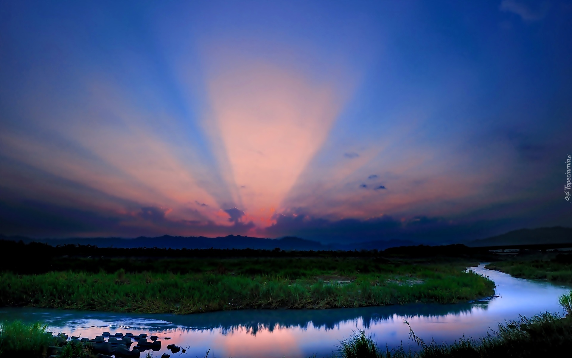 Edytor tapety: Rzeka, Zachód, Słońca, Łąka