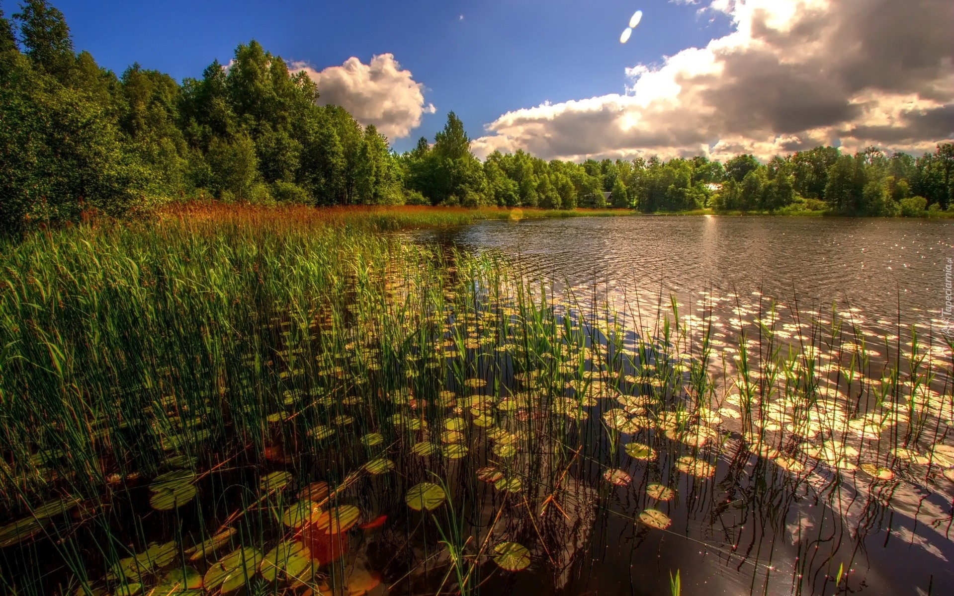 Edytor tapety: Jezioro, Drzewa, Trawy, Chmury