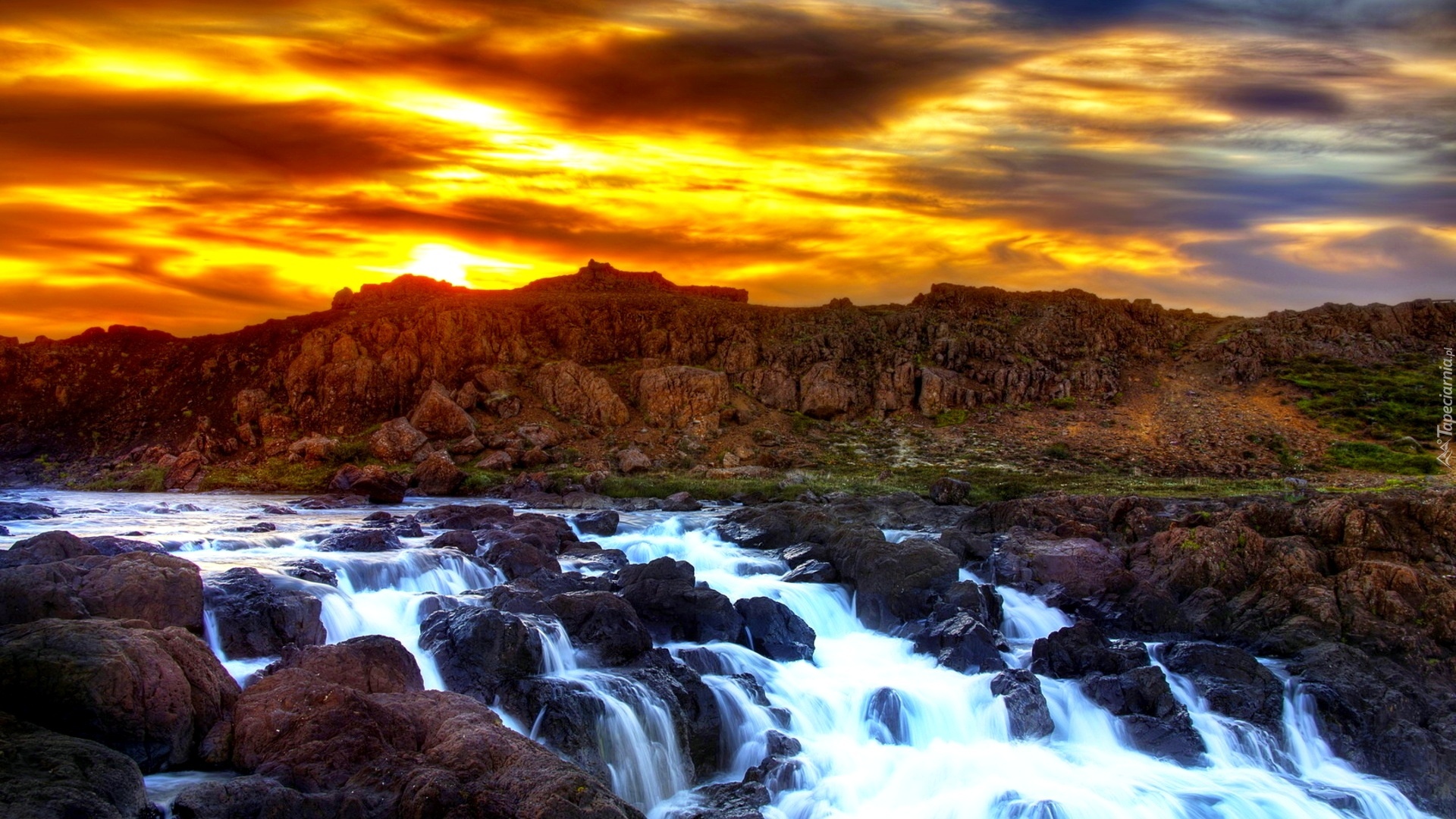 Edytor tapety: Zachód, Słońca, Skały, Wodospad
