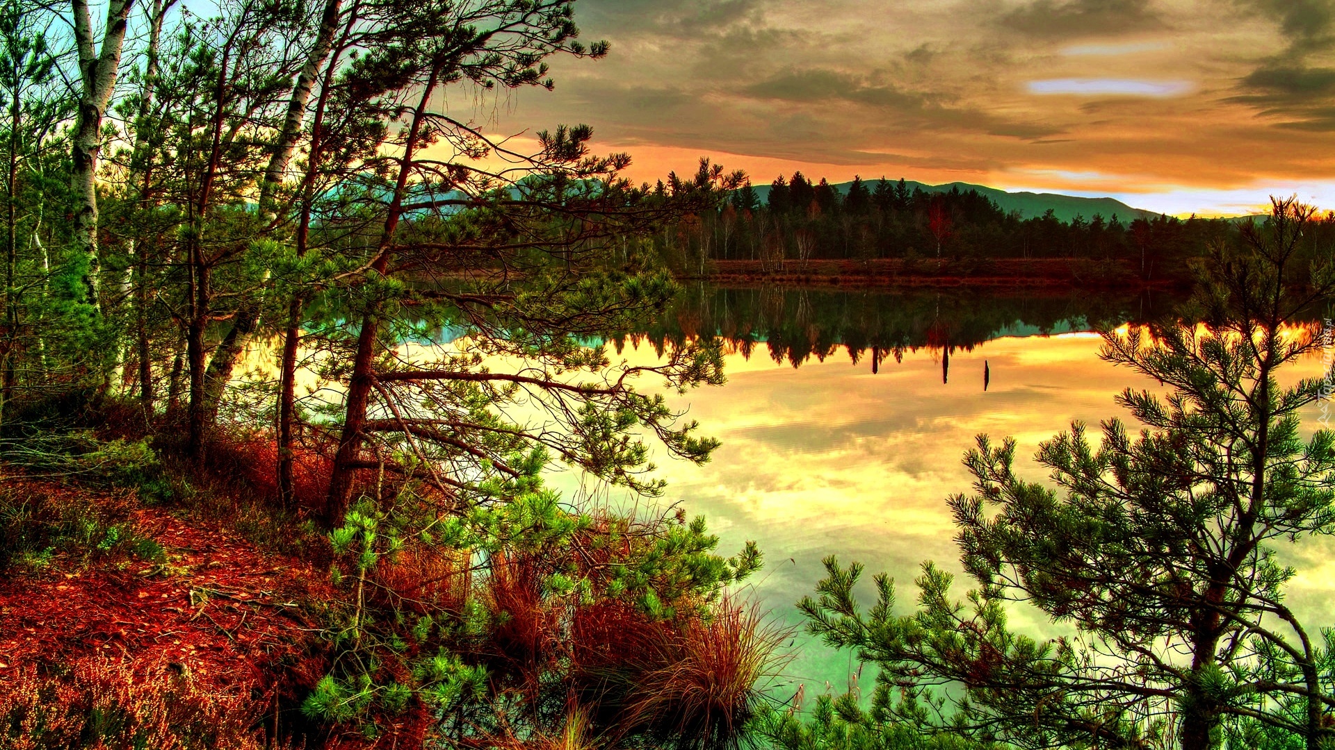 Edytor tapety: Zachód, Słońca, Lasy, Jezioro
