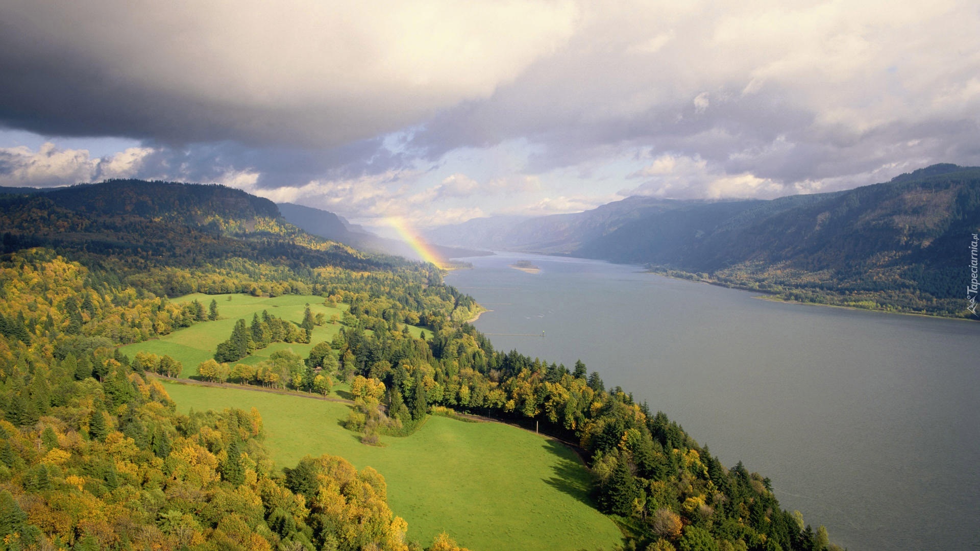 Edytor tapety: Góry, Rzeka, Lasy, Tęcza