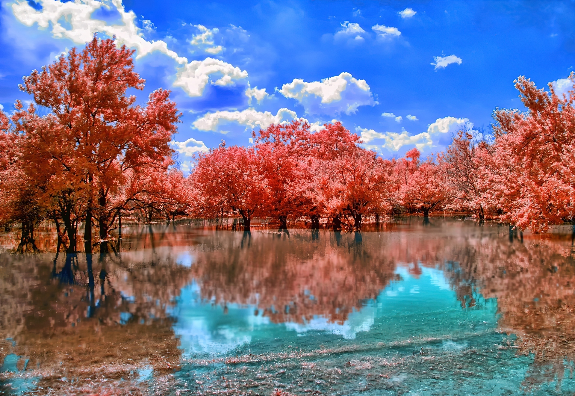 Edytor tapety: Drzewa, Czerwone, Liście, Jezioro