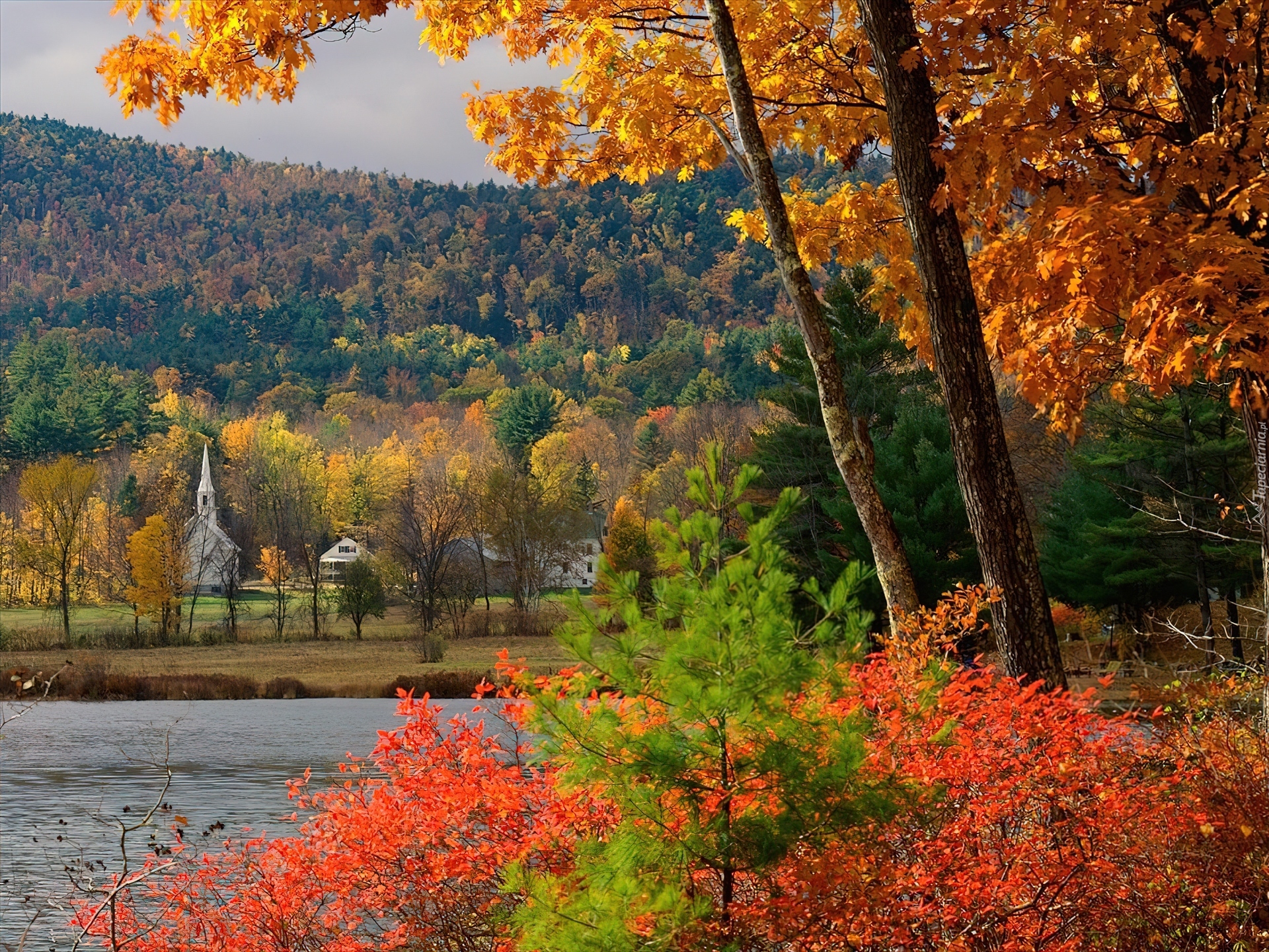 Edytor tapety: Kościółek, Rzeka, Kolorowe, Jesienne, Drzewa