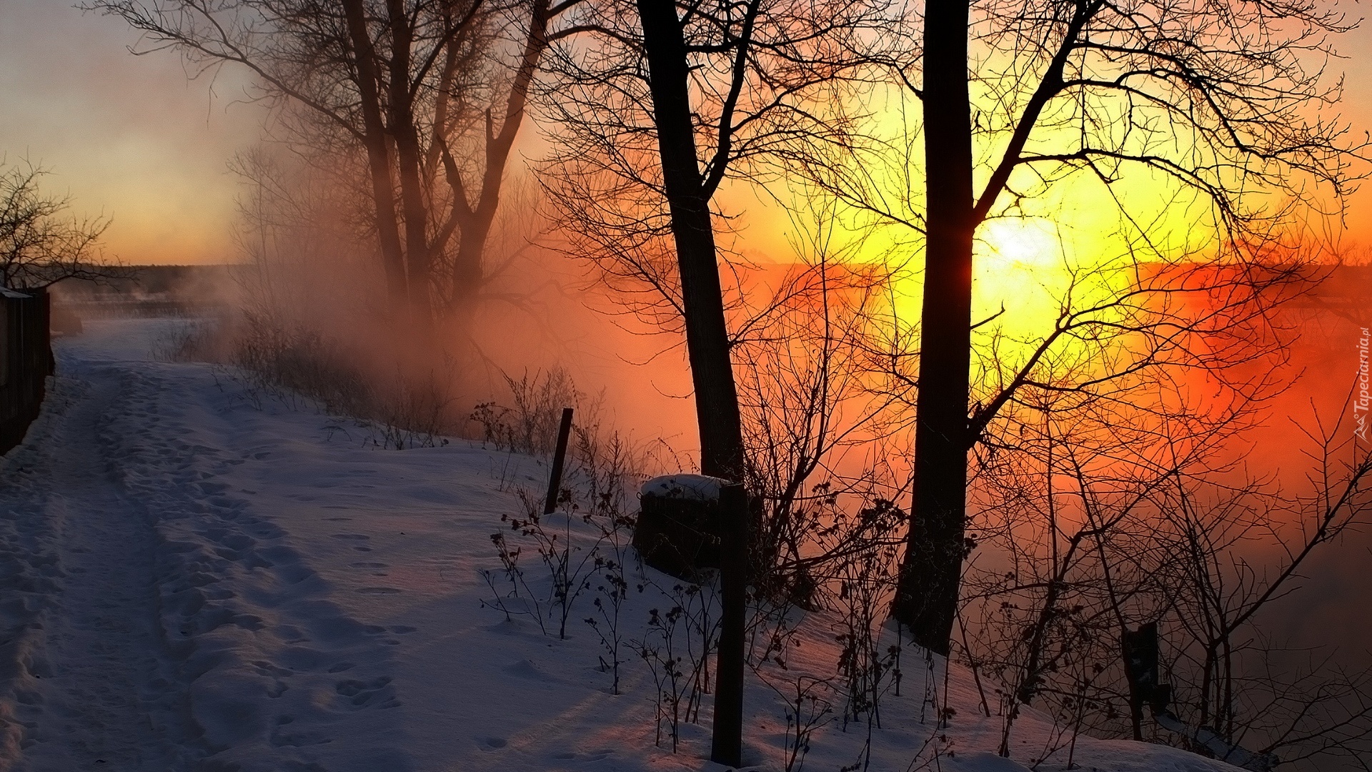 Edytor tapety: Zachód, Słońca, Dróżka, Drzewa, Mgła, Zima