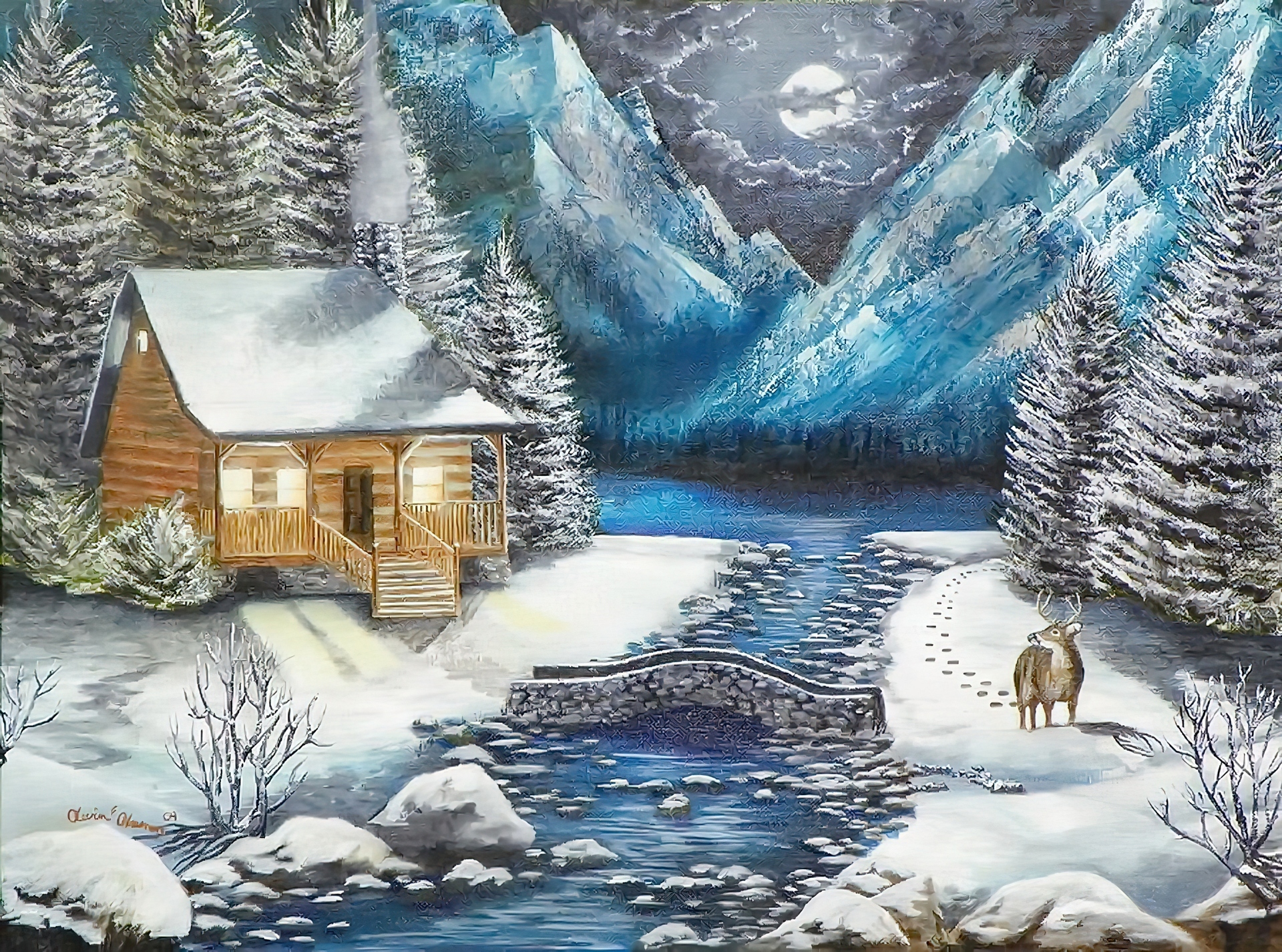 Edytor tapety: Widoczek, Zima, Góry, Domek, Rzeka, Malarstwo