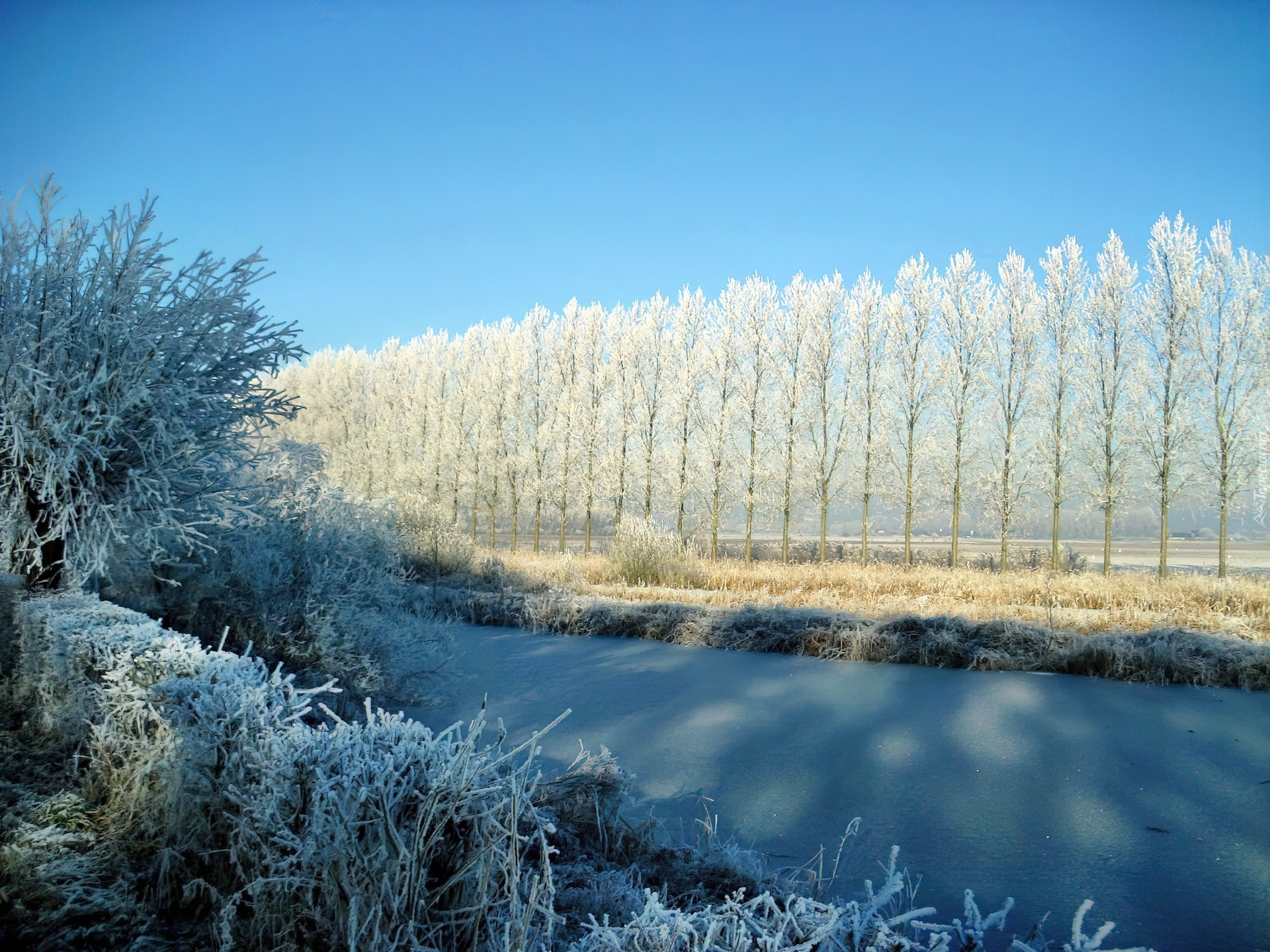 Edytor tapety: Rzeka, Oszronione, Krzewy, Drzewa