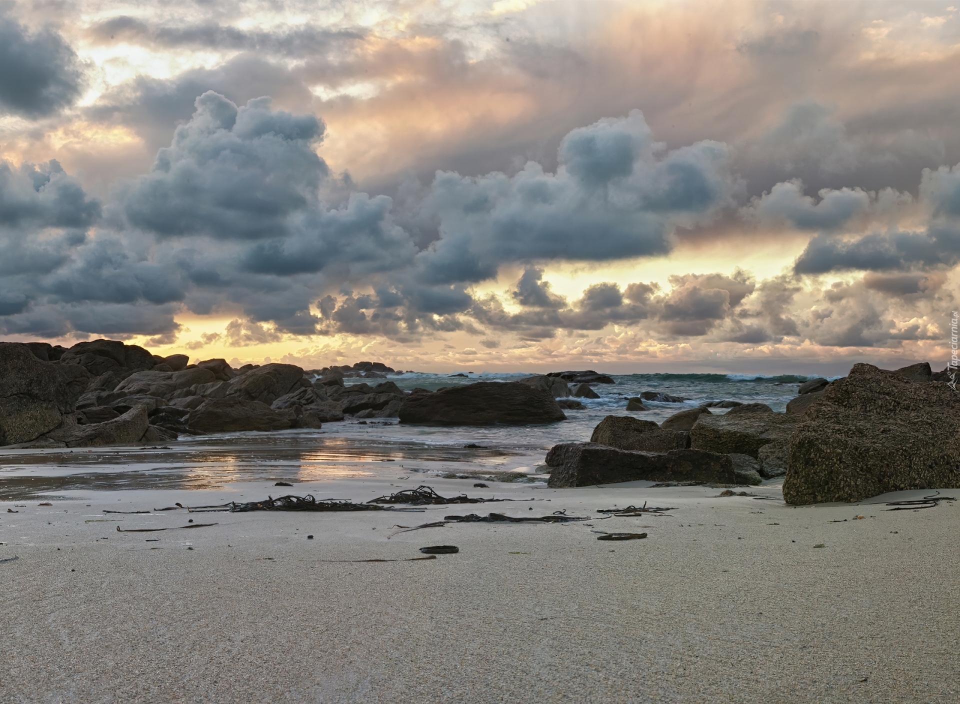 Edytor tapety: Plaża, Piasek, Skały, Chmury