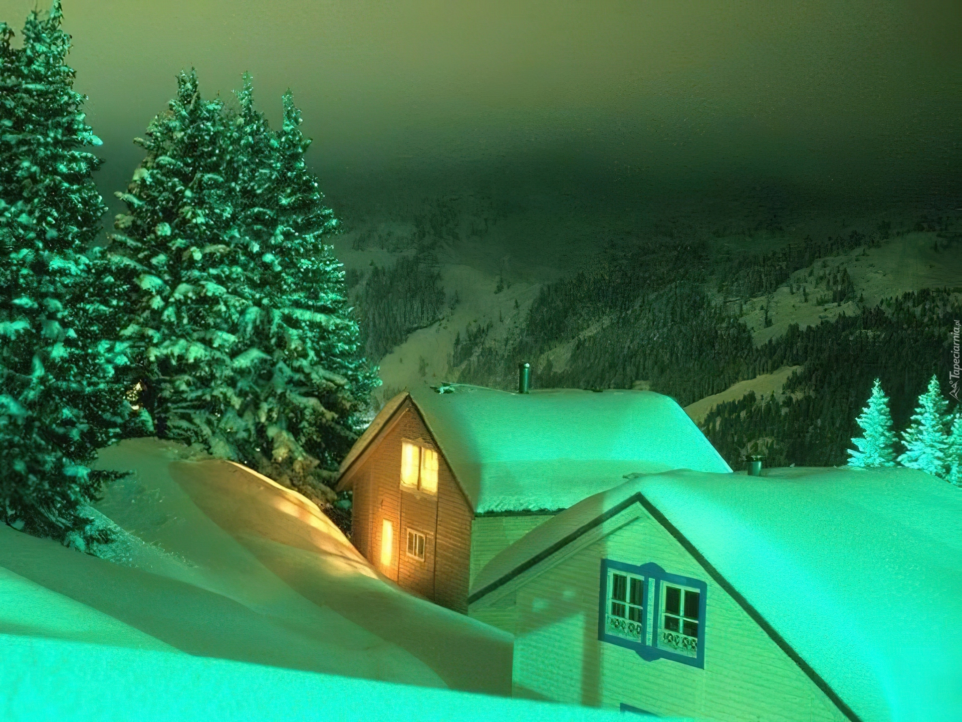 Edytor tapety: Domki, Ośnieżone, Drzewa, Noc