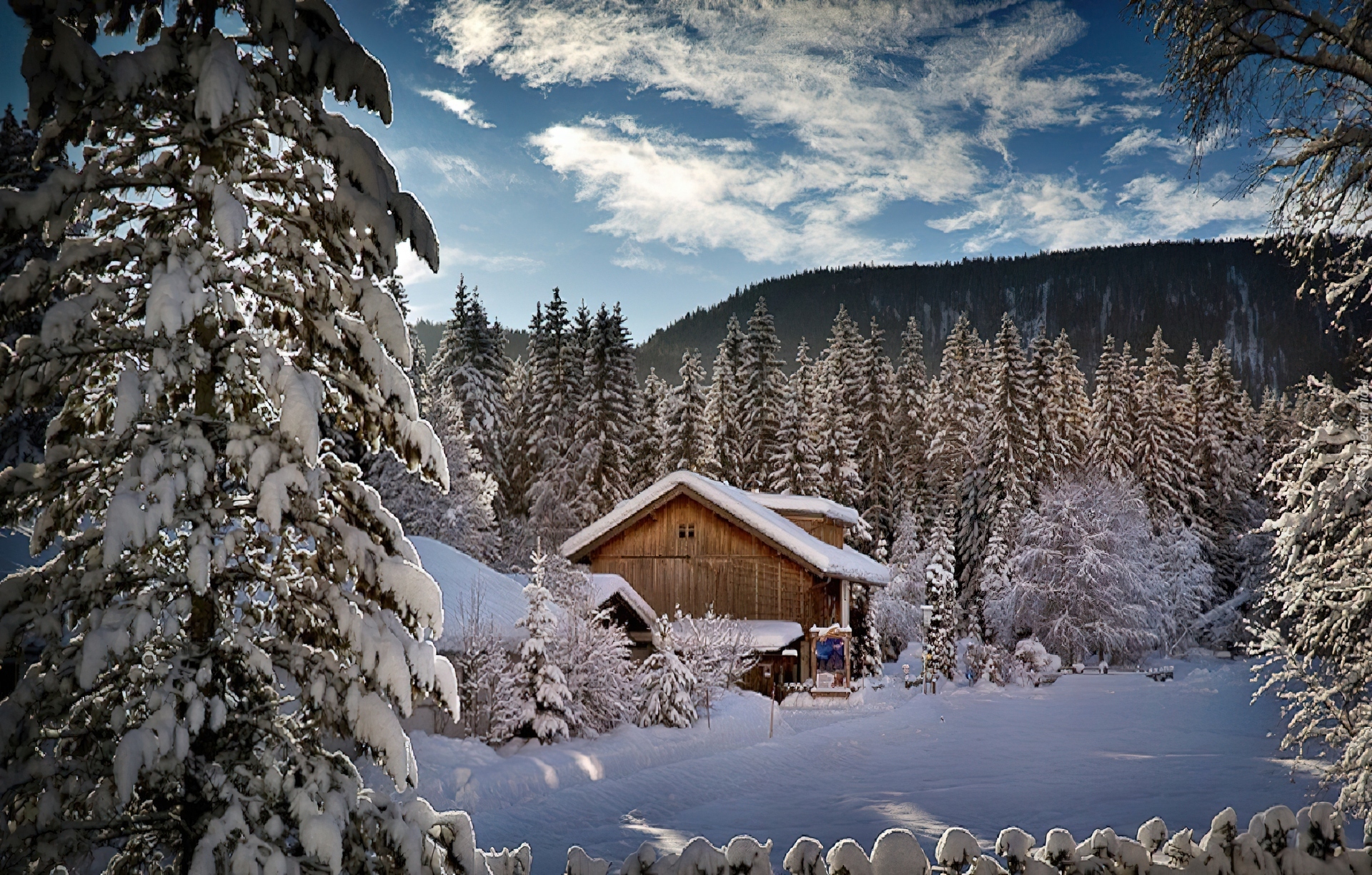 Edytor tapety: Chmury, Góry, Lasy, Domek