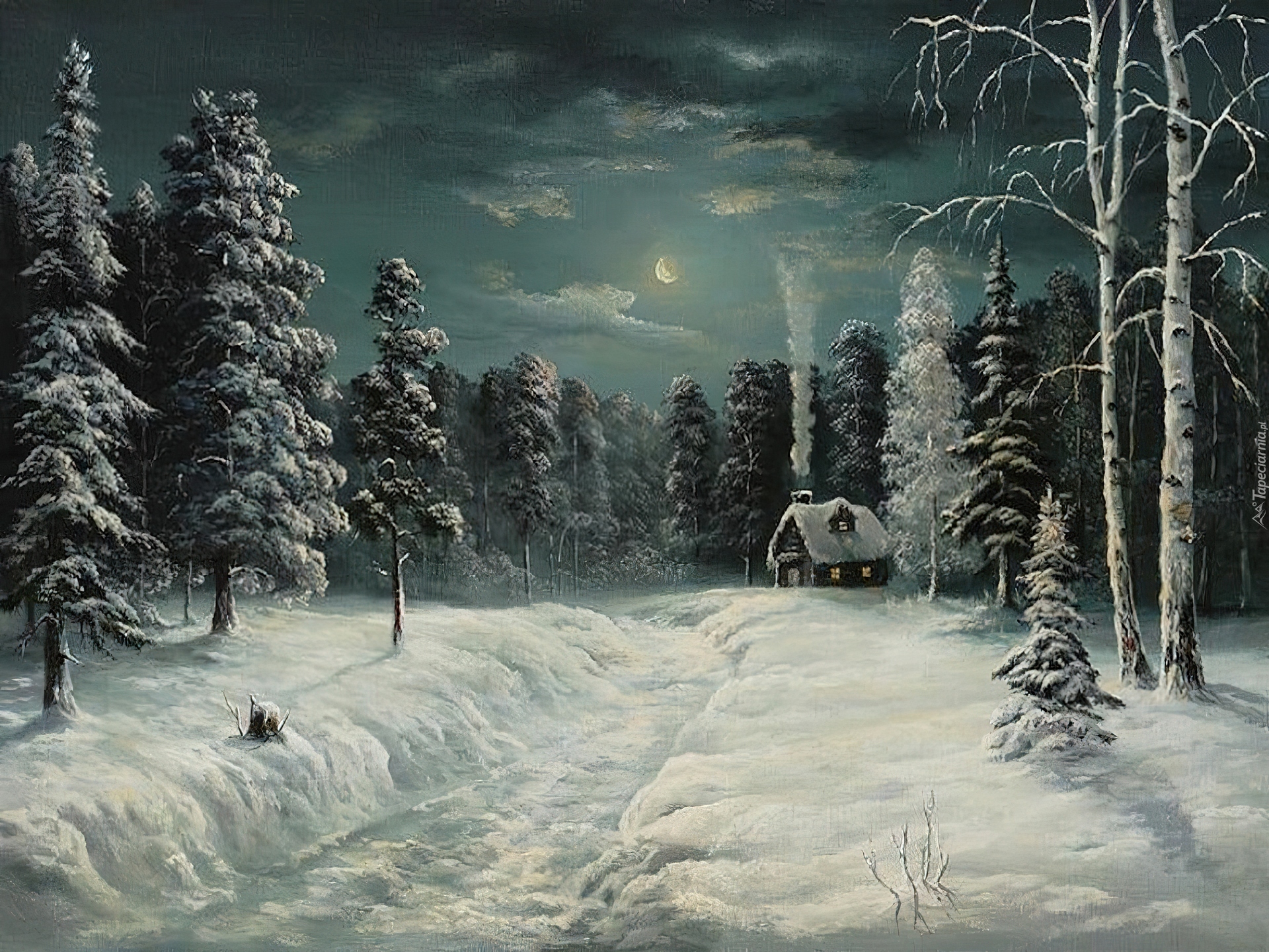 Edytor tapety: Domek, W, Lesie, Zimowa, Noc