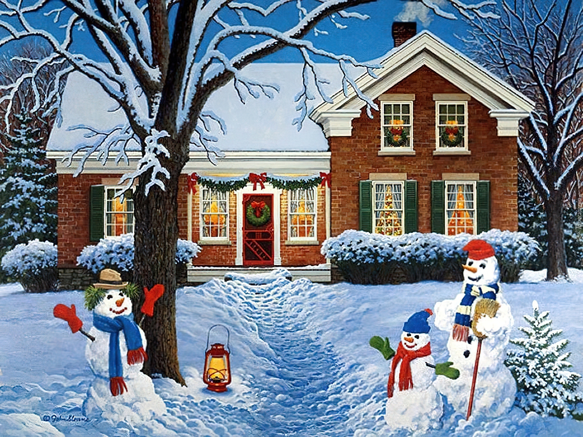 Edytor tapety: Bałwany, Dom, Zima, Boże, Narodzenie, Malarstwo