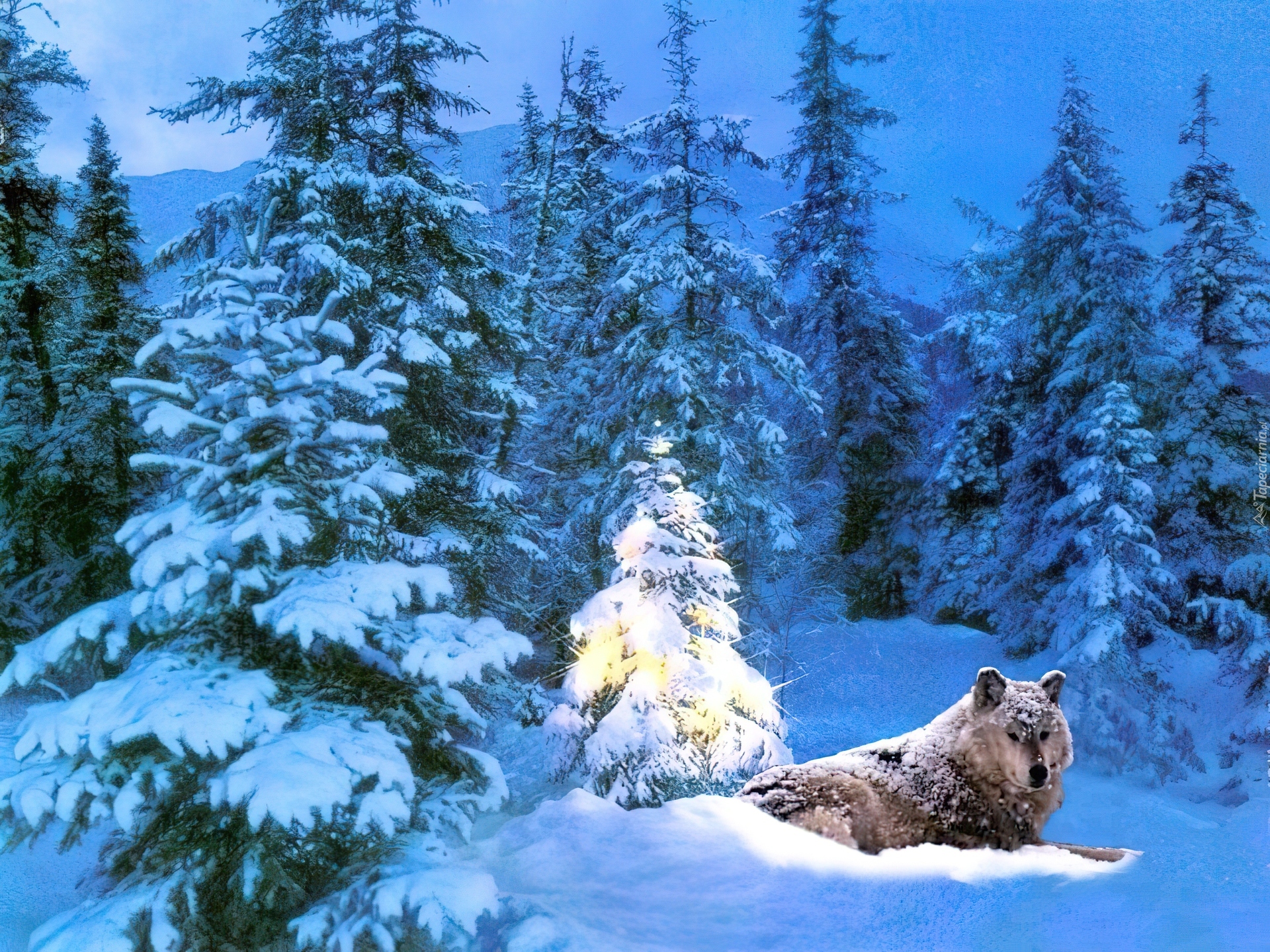 Edytor tapety: Wilk, Choinka, Śnieg