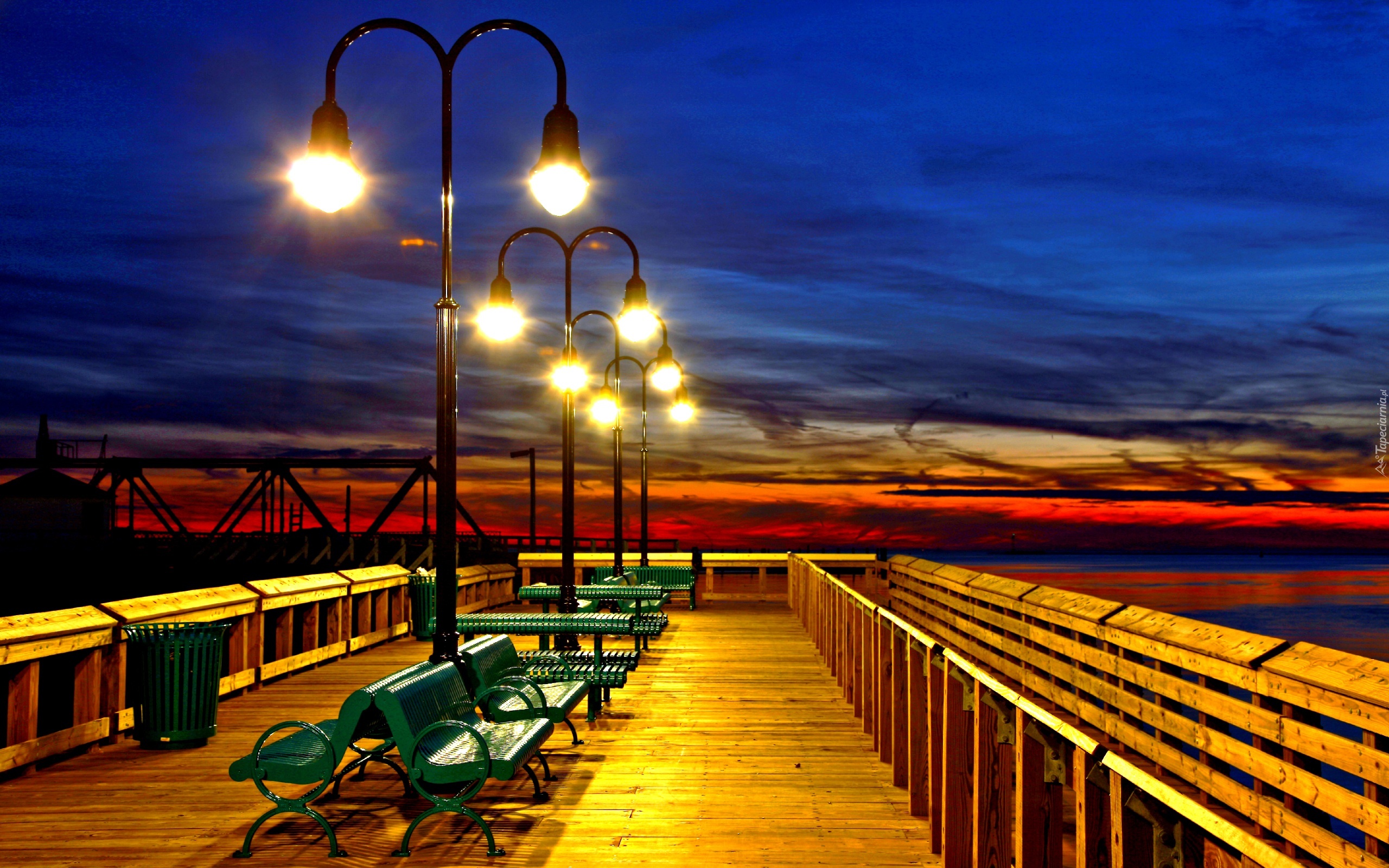 Edytor tapety: Molo, Ławki, Oświetlone, Lampy