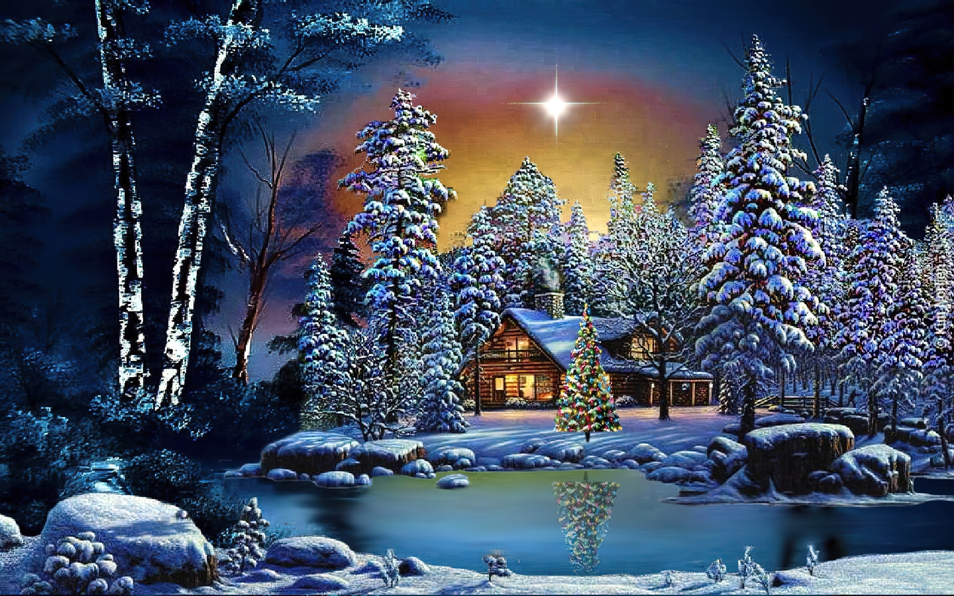 Edytor tapety: Rzeka, Drzewa, Domek, Zima, Święta