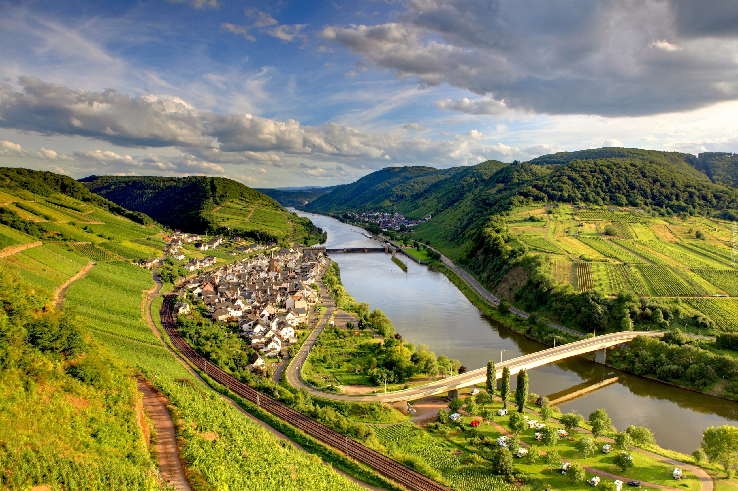 Edytor tapety: Rzeka, Domy, Mosty, Pola, Chmury