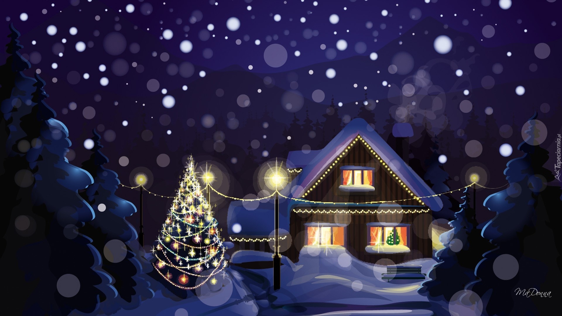 Edytor tapety: Dom, Choinka, Zima, Boże, Narodzenie, Grafika
