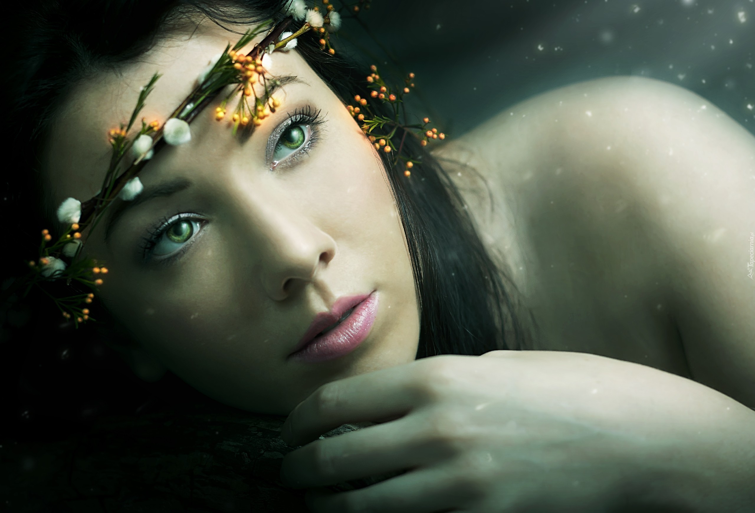 Edytor tapety: Kobieta, Wianek, Zielone, Oczy
