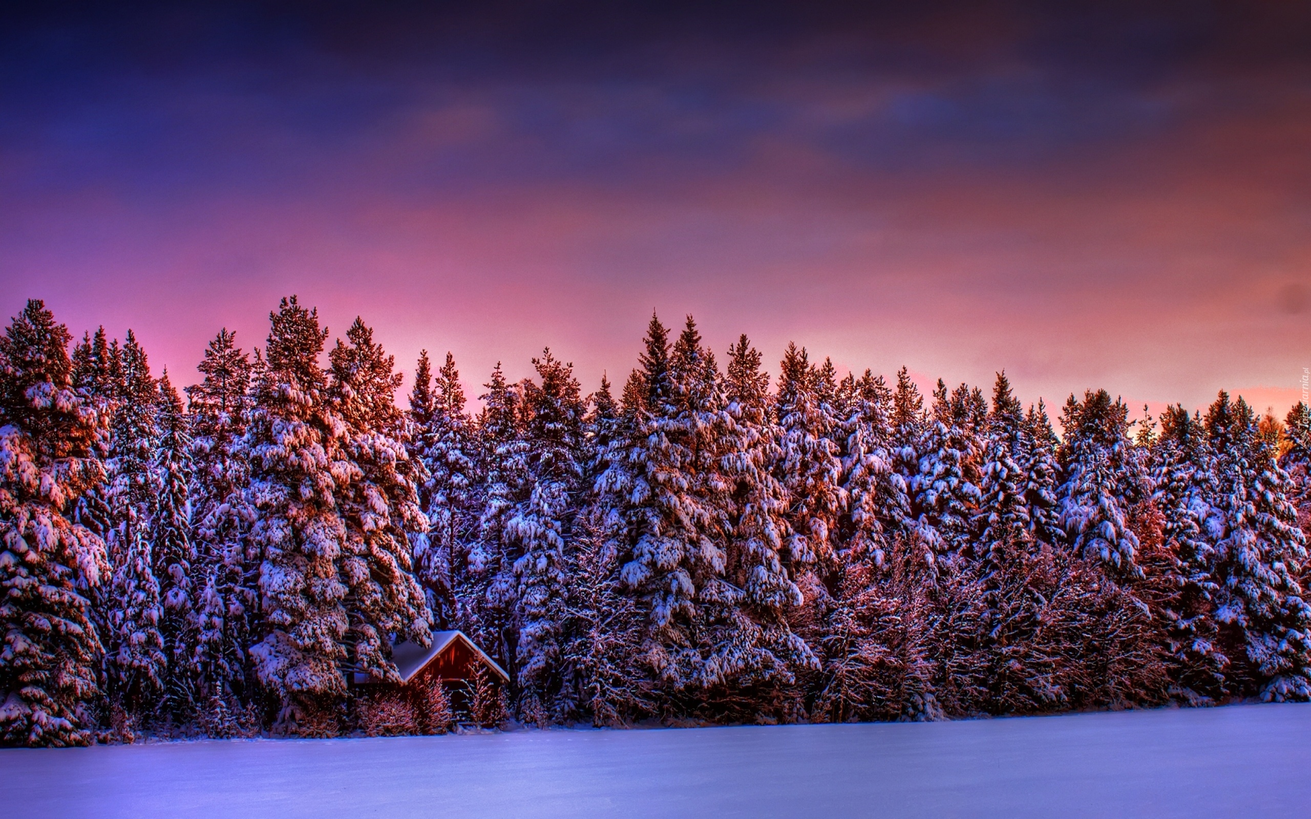 Edytor tapety: Zachód, Słońca, Świerki, Zima