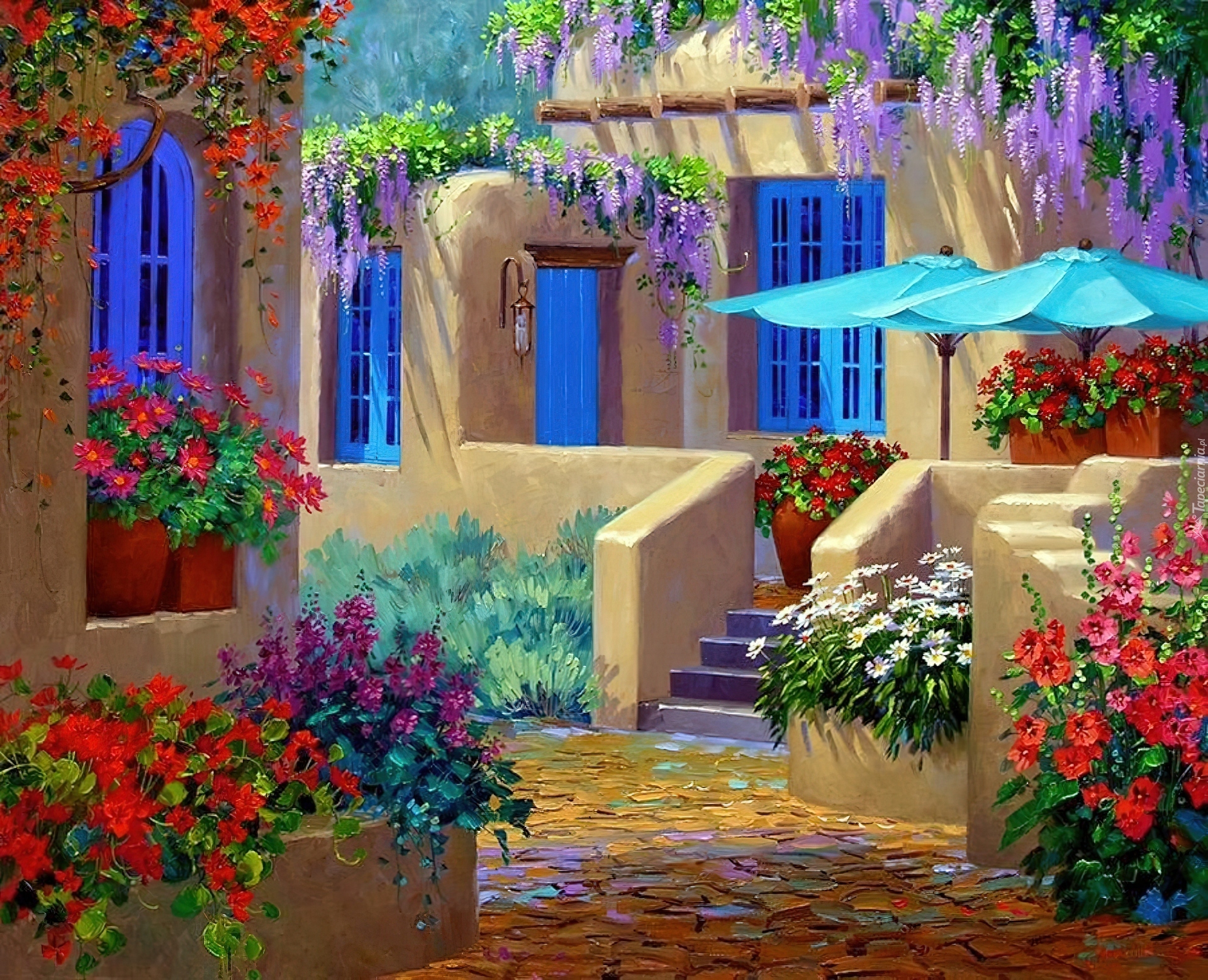 Edytor tapety: Fasady, Budynków, Kolorowe, Kwiaty