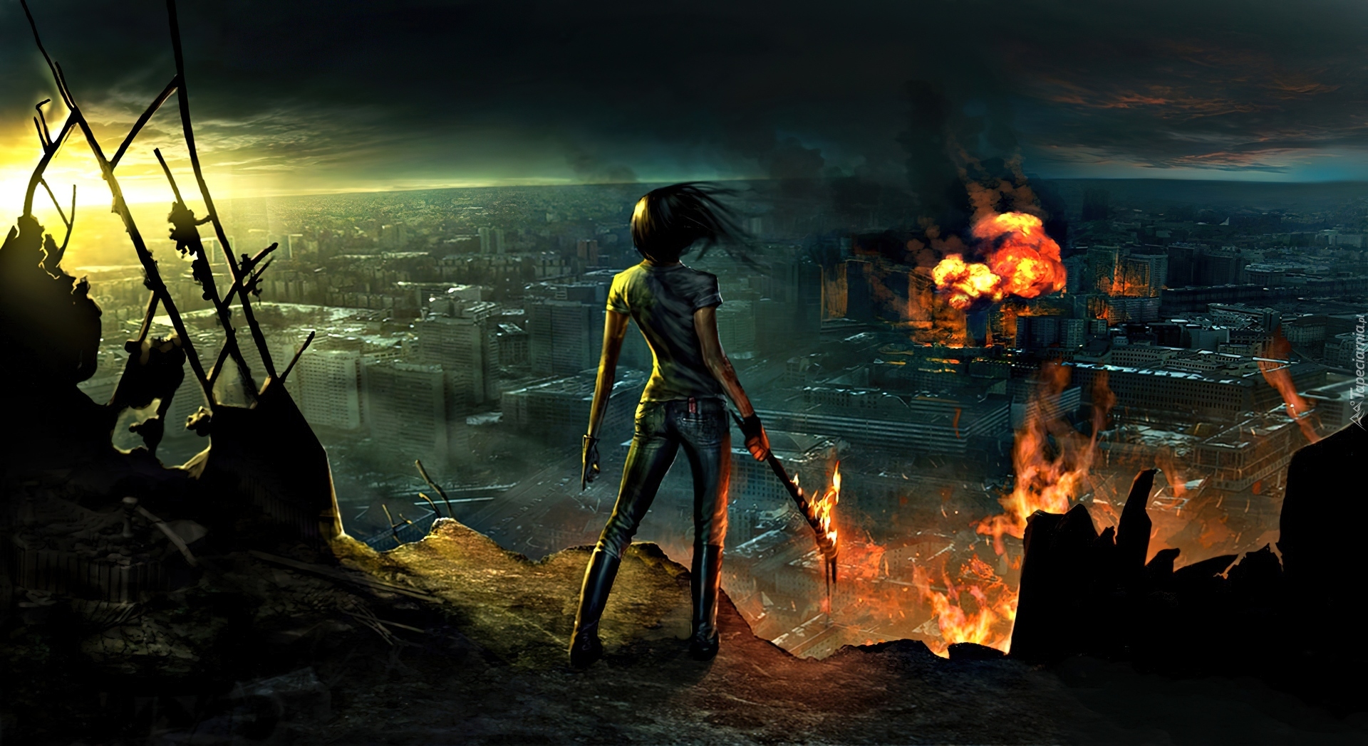 Edytor tapety: Kobieta, Miasto, Ogień, Zgliszcza