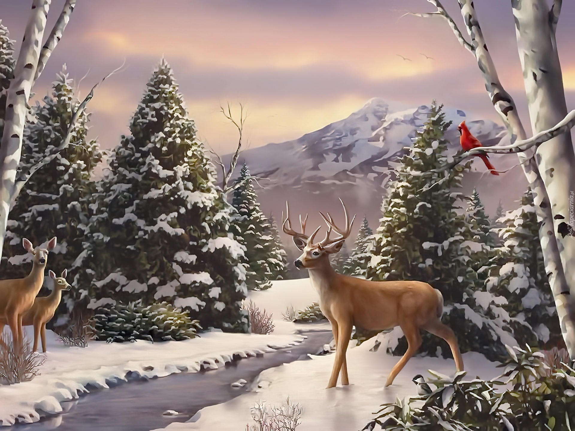 Edytor tapety: Drzewa, Jeleń, Strumyk, Malarstwo