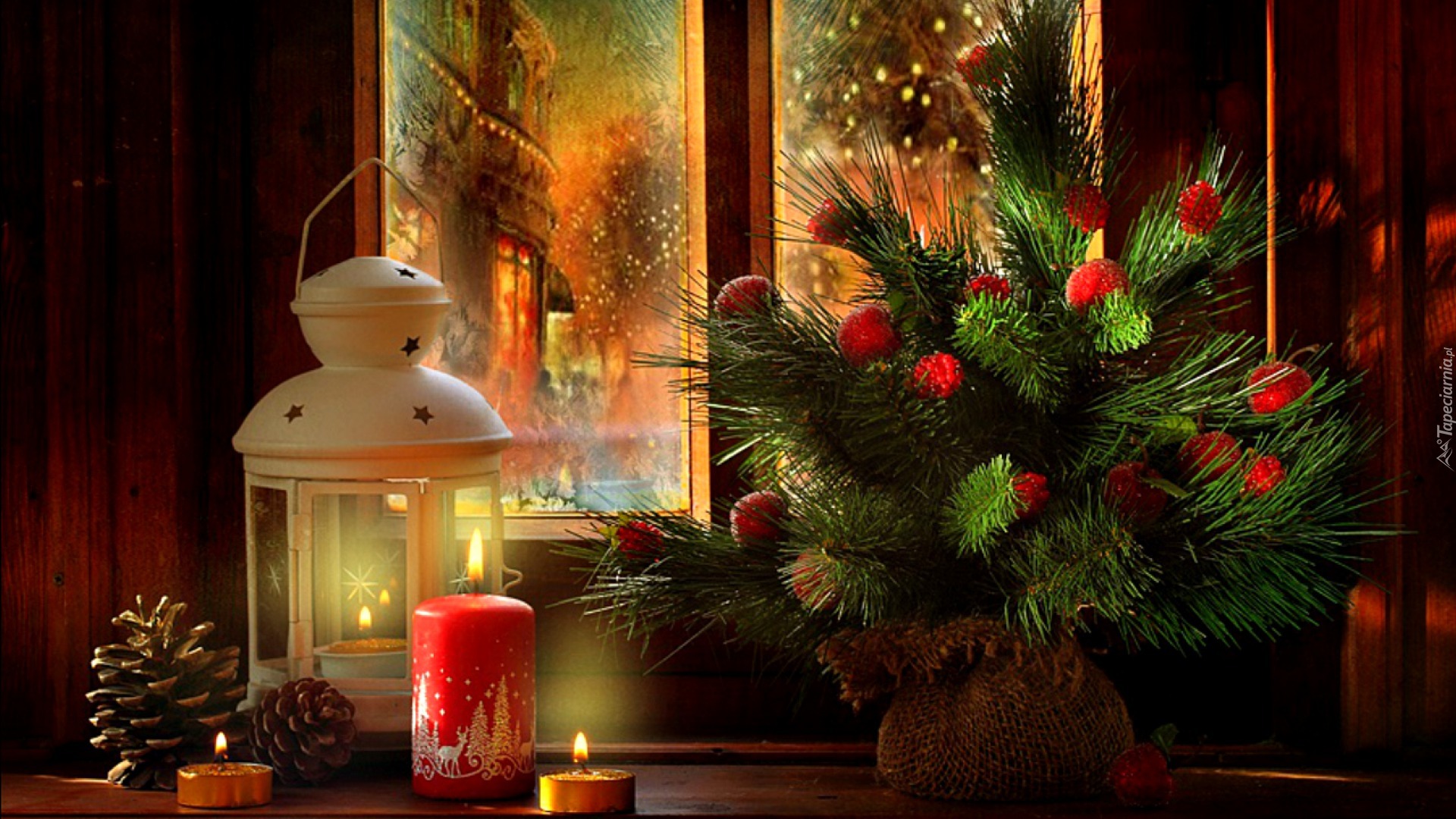 Edytor tapety: Stroik, Świeca, Okno, Boże Narodzenie, Świąteczne, Kompozycja, Lampion